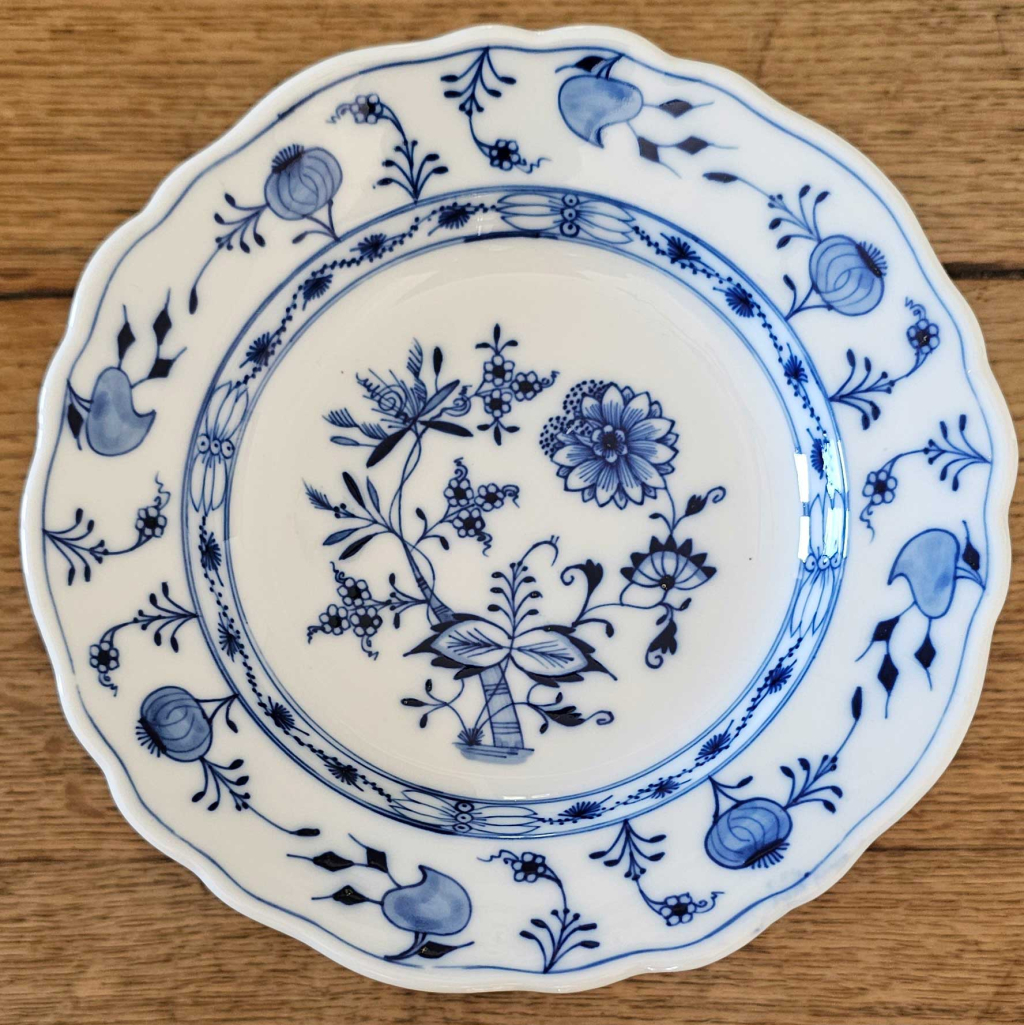 "Ce service de table a été transmis dans la famille de génération en génération, sans qu’il m’ait été possible d’en remonter à l’origine au-delà de 80 ans. Au regard du service à café faisant partie de la même transmission, il est possible que ce soit des pièces de la seconde moitié du XIXème. Le motif original est celui de la série « oignon bleu ». Ce service comporte : - 33 assiettes plates de 25 cm de diamètre ; - 16 assiettes plates de 21 cm de diamètre ; - 12 assiettes plates de 17 cm de diamètre ; - 12 assiettes creuses de 25 cm de diamètre ; - 1 saucière de 22 cm de long ; - 1 soupière ; - 1 plat de service avec couvercle, de 21 x 28 cm ; - 1 saladier carré de 24 cm de côté ; - 1 plat de 31 x 48 cm ; - 1 plat de 24 x 35 cm ; - 1 plat rond de 33 cm de diamètre ; - 1 plat rond de 30 cm de diamètre ; - 2 assiettes de présentation ajourées de 23 cm de diamètre ; - 2 assiettes de présentation de 23 cm de diamètre ; - 2 salière-poivrière ; - 2 plats en forme de feuille de 19 cm de long. Tout est en parfait état : très peu servi, conservé dans de bonnes conditions. Sauf un petit éclat sur la bordure de deux des grandes assiettes plates ; et un éclat plus marqué sur le plat de 48 cm de long."
