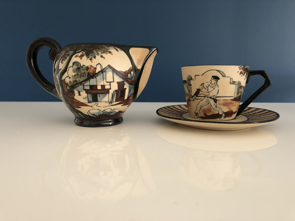 "Service en grès émaillé des poteries de Ciboure, décors néo basques avec paysages et personnages typiques. Signé R F ( Rodolphe Fischer 1945- 1977) Le service est constitué de 8 tasses er sous tasses, théière, pichet à café et pot à lait. Excellent état général, seules 3 tasses sont trés légèrement abimées, le reste étant comme neuf. L'estimation peut être faite pour le lot ou par pièce"