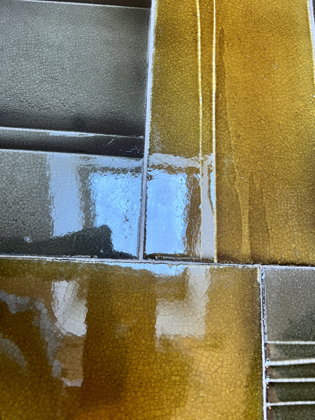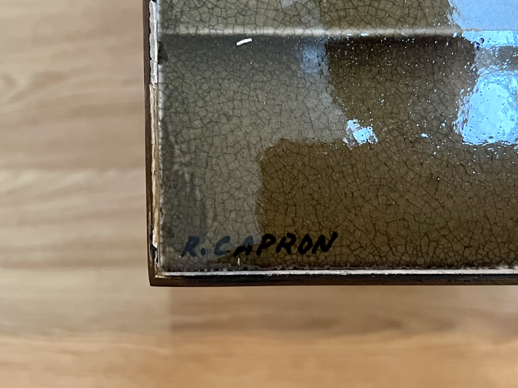 "Petite Table basse signée Capron en fer et céramique de Vallauris. Un éclat sur un côté et joints manquants. Dans ma famille depuis son acquisition, pas de facture."