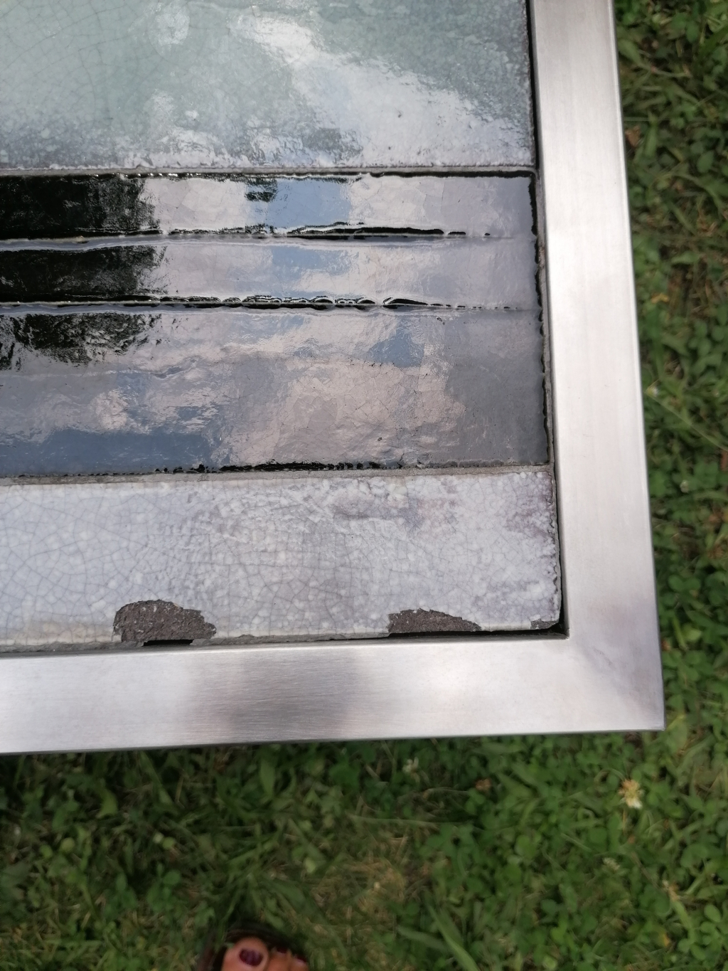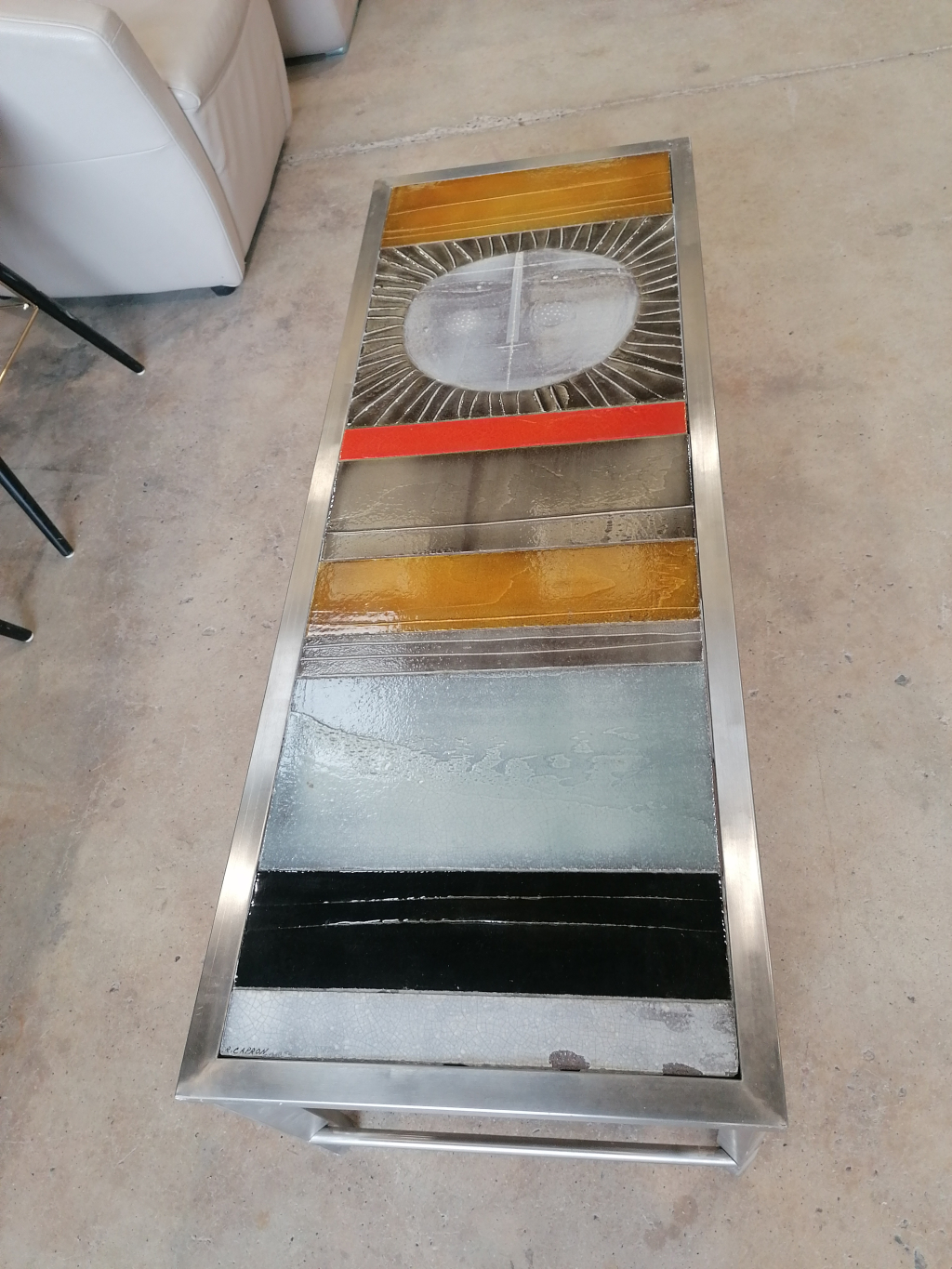 "Table basse soleil signée R Capron Structure en acier 2 petits éclats céramique 39 ×47 ×126"