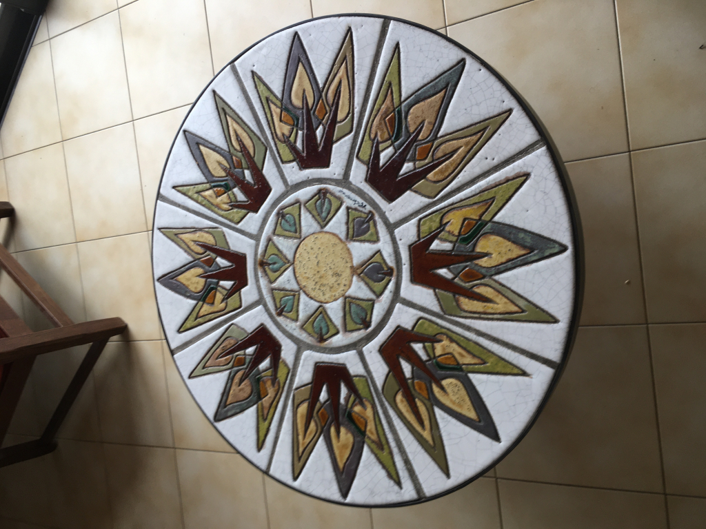 "Table acquise par père qui vient de décéder, achetée à son ami. Diamètre de 78 cms et de 36 cms de hauteur"