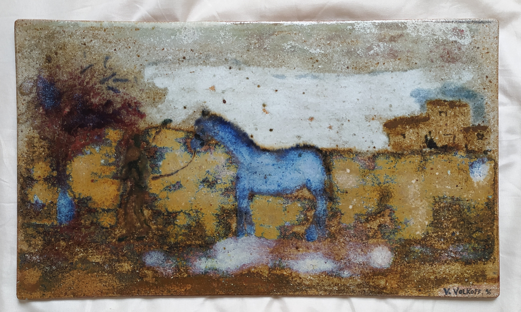 "Oeuvre de Voldemar VOLKOFF (1932-2007) Plaque rectangulaire à angles arrondis. Grès chamotté, faïence émaillée. Hauteur 26 cm Largeur : 44,5 cm Epaisseur : 5 à 6 mm Signée et datée (1996) en bas à droite. Prêt à suspendre grâce à l'attache d'origine conçue par l'artiste. Céramiste et peintre, Voldemar VOLKOFF s'est installé à Vallauris, haut lieu de création de céramique en 1960 et y est décédé en 2007."
