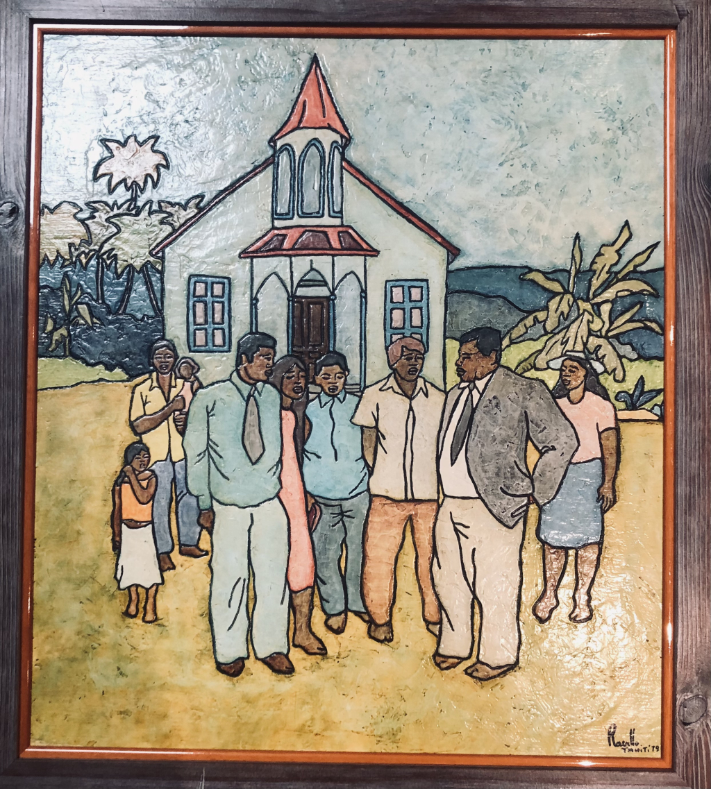 "Faïence sur bois Devant l’église tahitie 1979 57x50 Faïence sur bois"