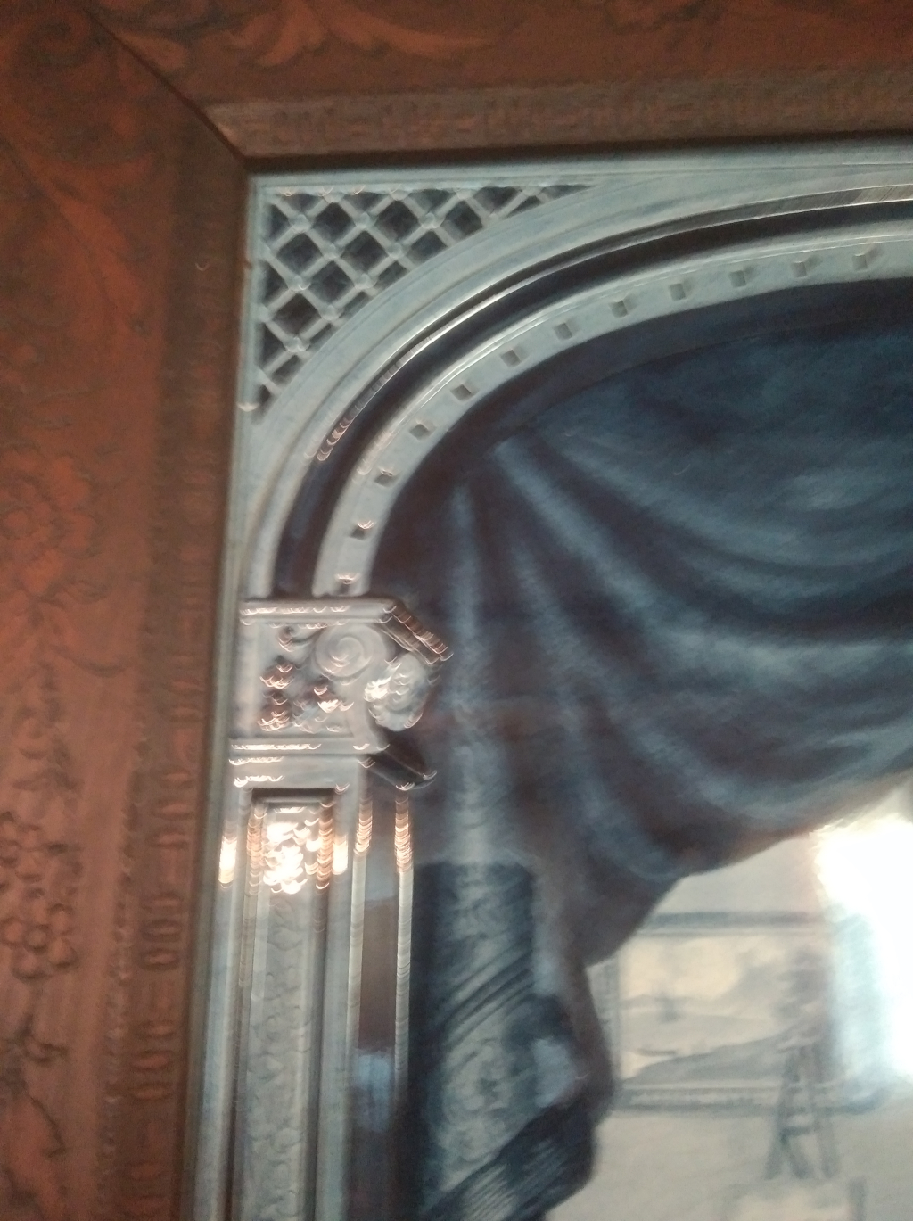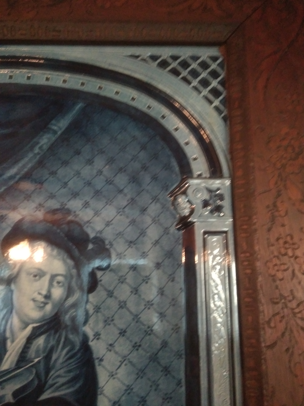 "tableau représentant un violoniste du 17 ou 18 ème siècle, avec large cadre ciselé en bois."