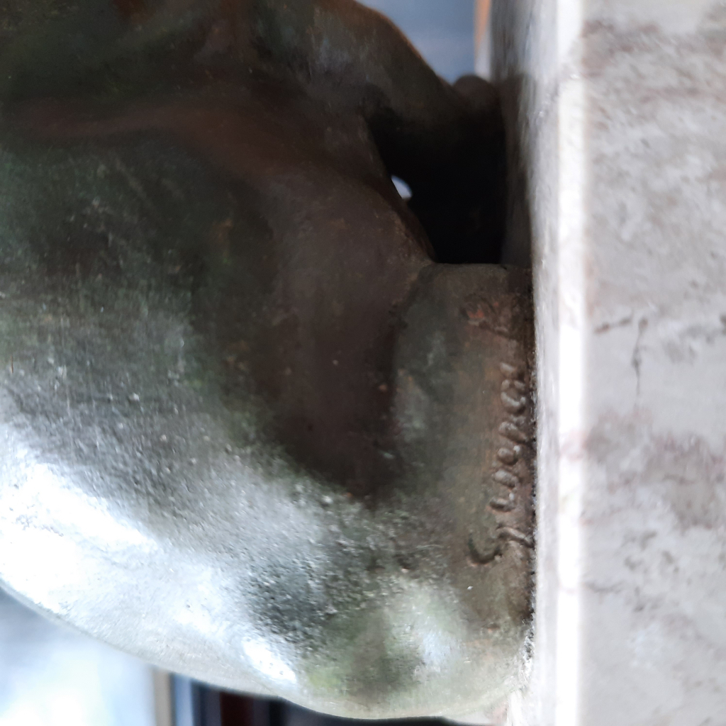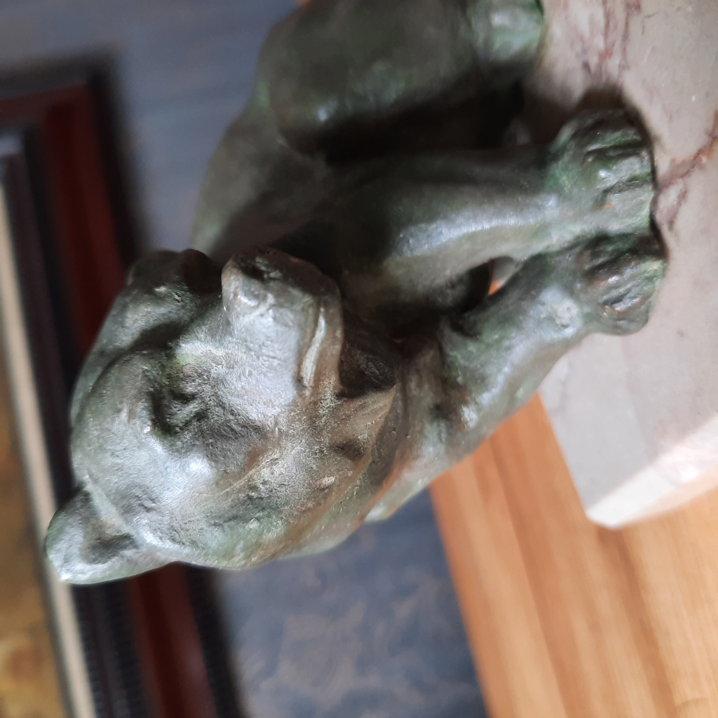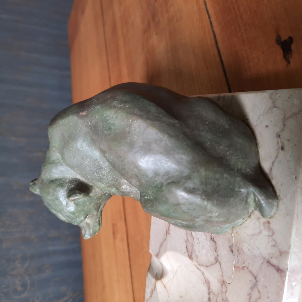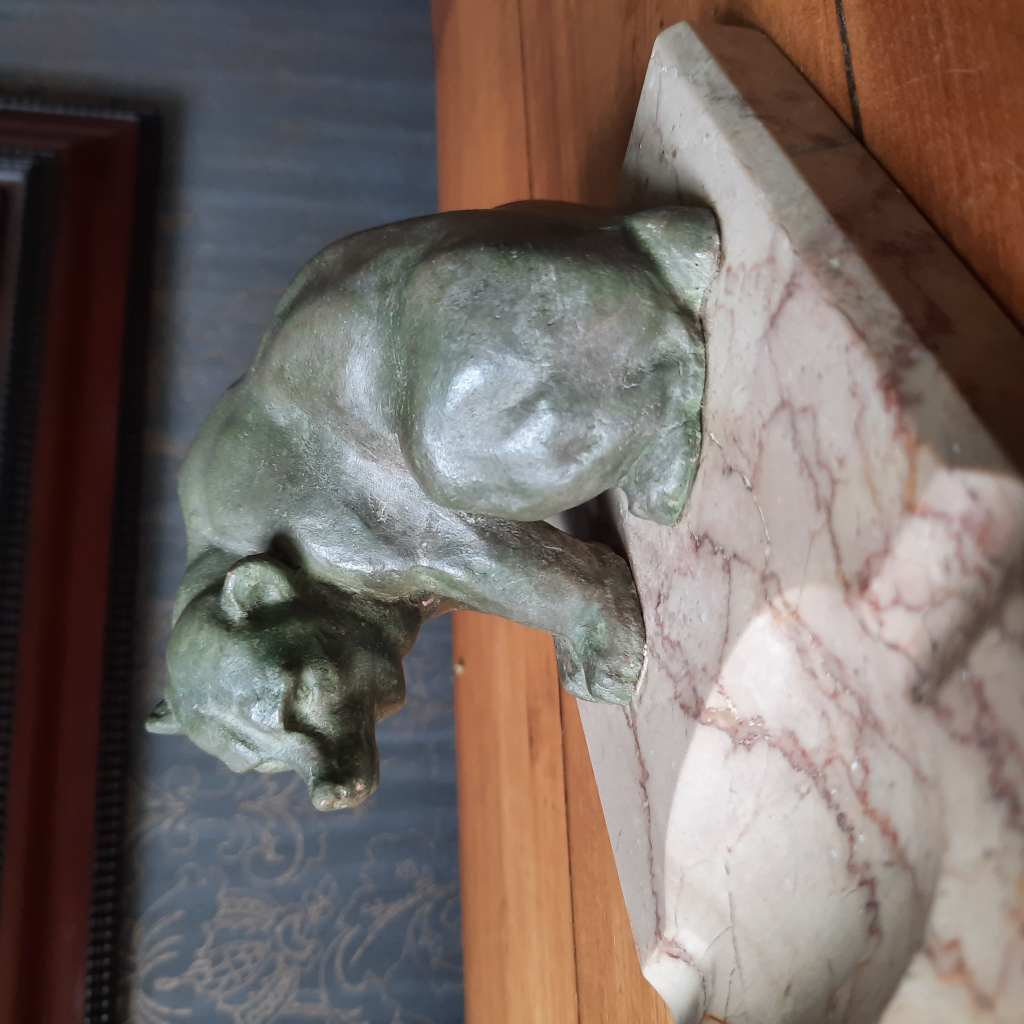 "Terre cuite signée Georges Guyot représentant un ours. Cette sculpture a été collée sur un cendrier en marbre et n'est donc pas d'origine. En très bon état."
