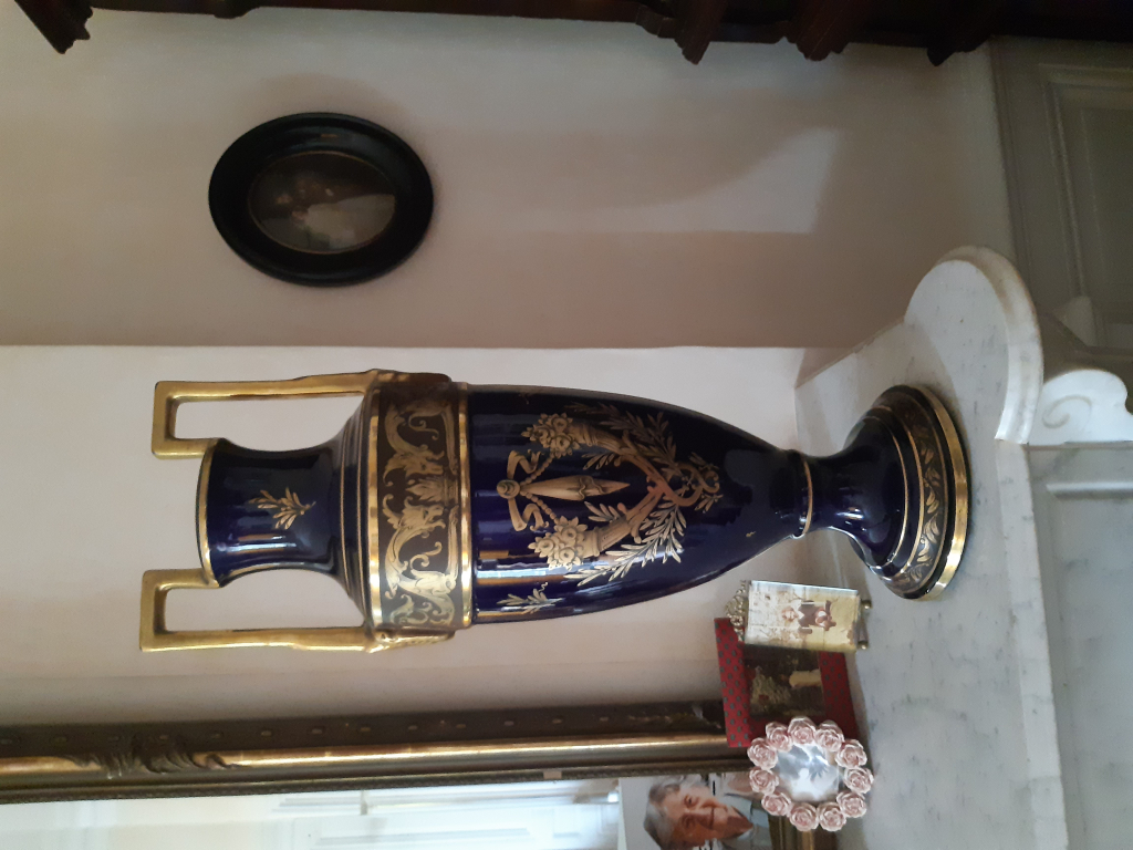"2 vases identiques pour décoration par exemple dessus de cheminée comme sur photos jointes. Matière "ceramique" (?) avec dorure.. Taille : H 62 cm Diamètre max 20 cm. PJ: 2 photos des 2 objets + 2 photos pour visionner des infos gravées sous le socle des "vases""