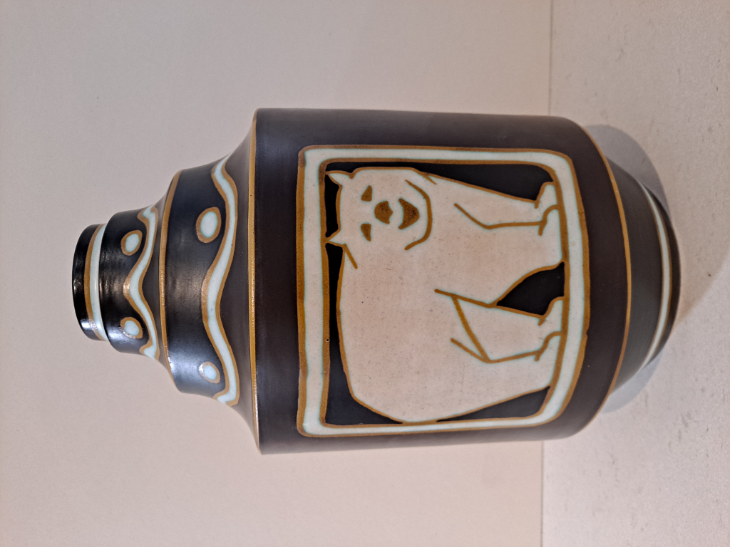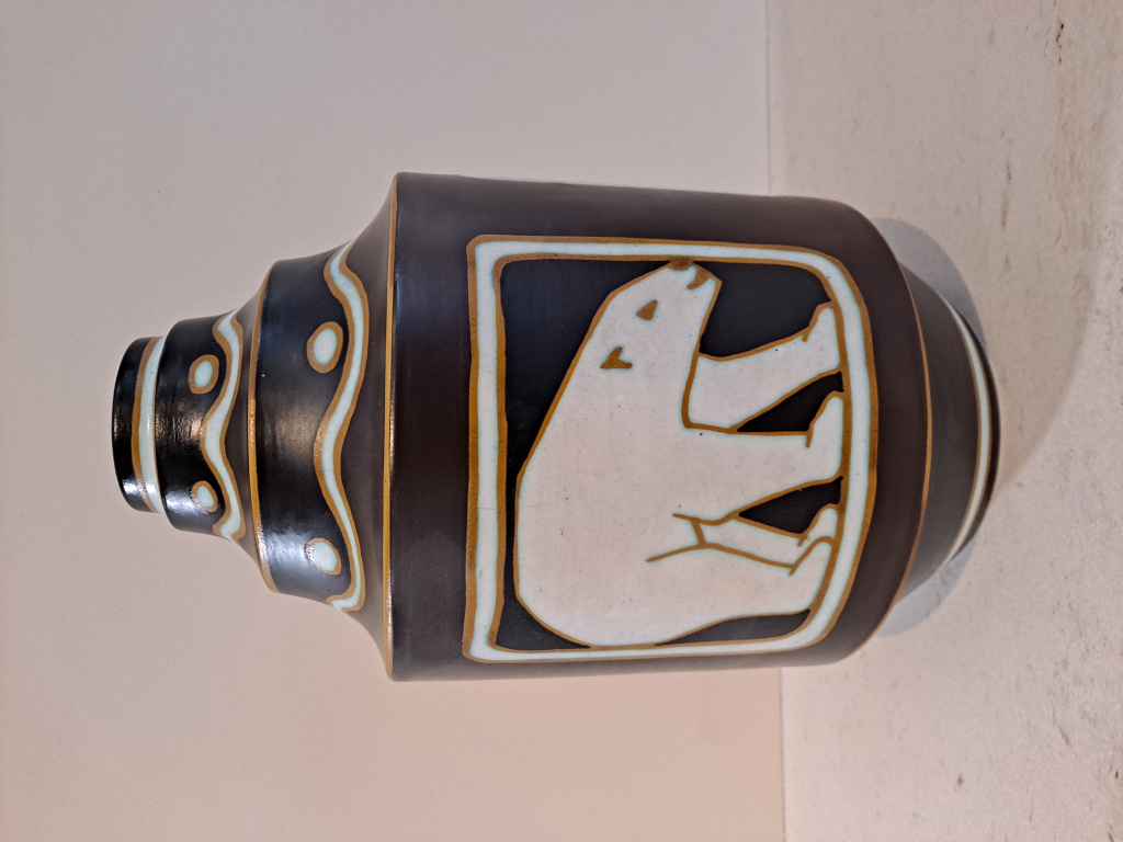 "Vase forme 1082 décor 1063 : décor alterné d'ours polaires blancs sur fond noir avec décor géométrique au col"
