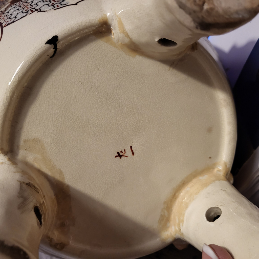 "Vase chinois avec poignée dragons et couvercle en relief avec dorures et dessin en relief Je ne serai dire qu'elle matière il est réalisé Signature sous le socle"