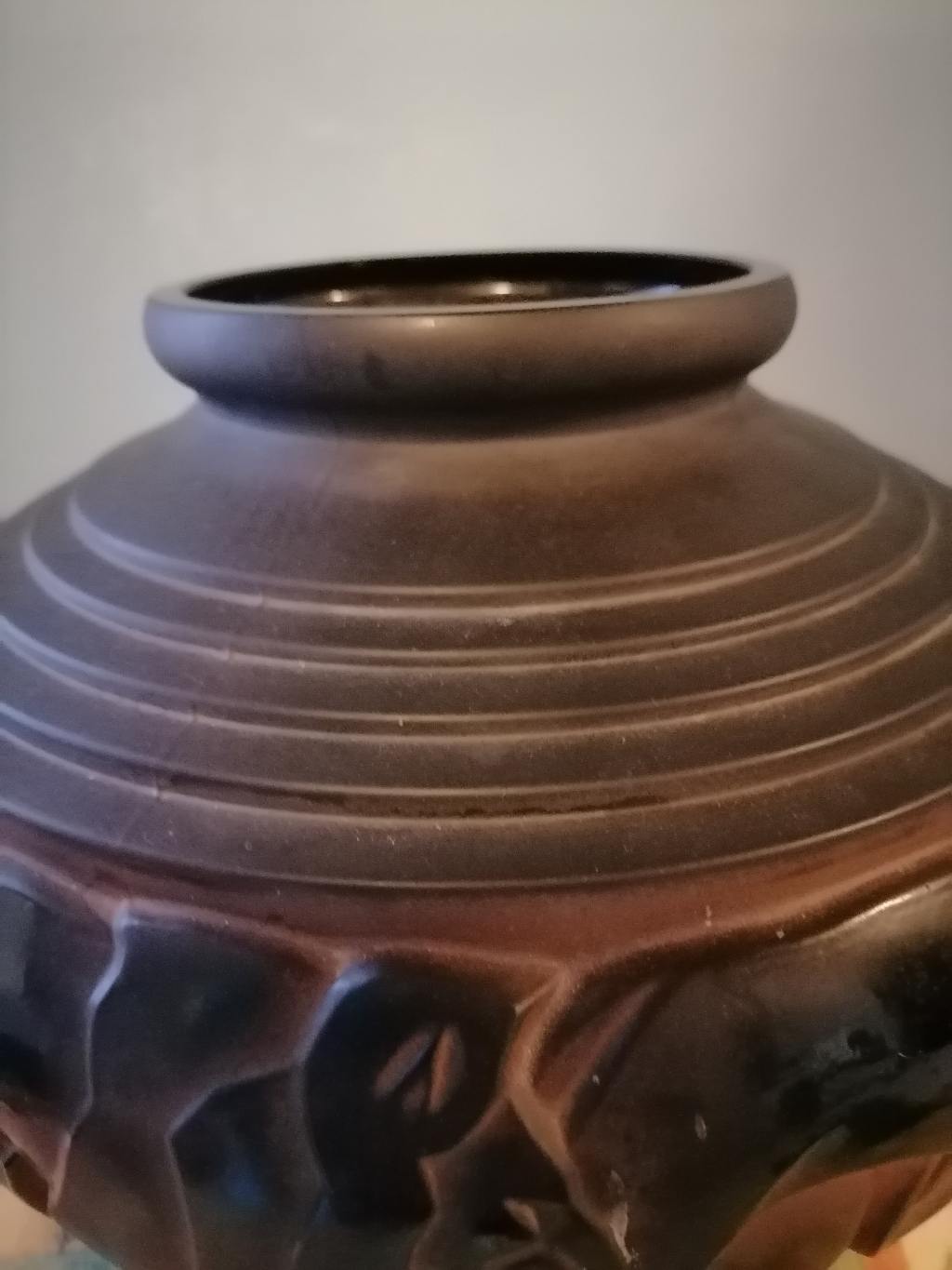 "Vase en verre noir moulé cors ovoïde et col ourlé, troupeau de lion et lionne, signé Pierre D'AVENIR. Héritage familial"