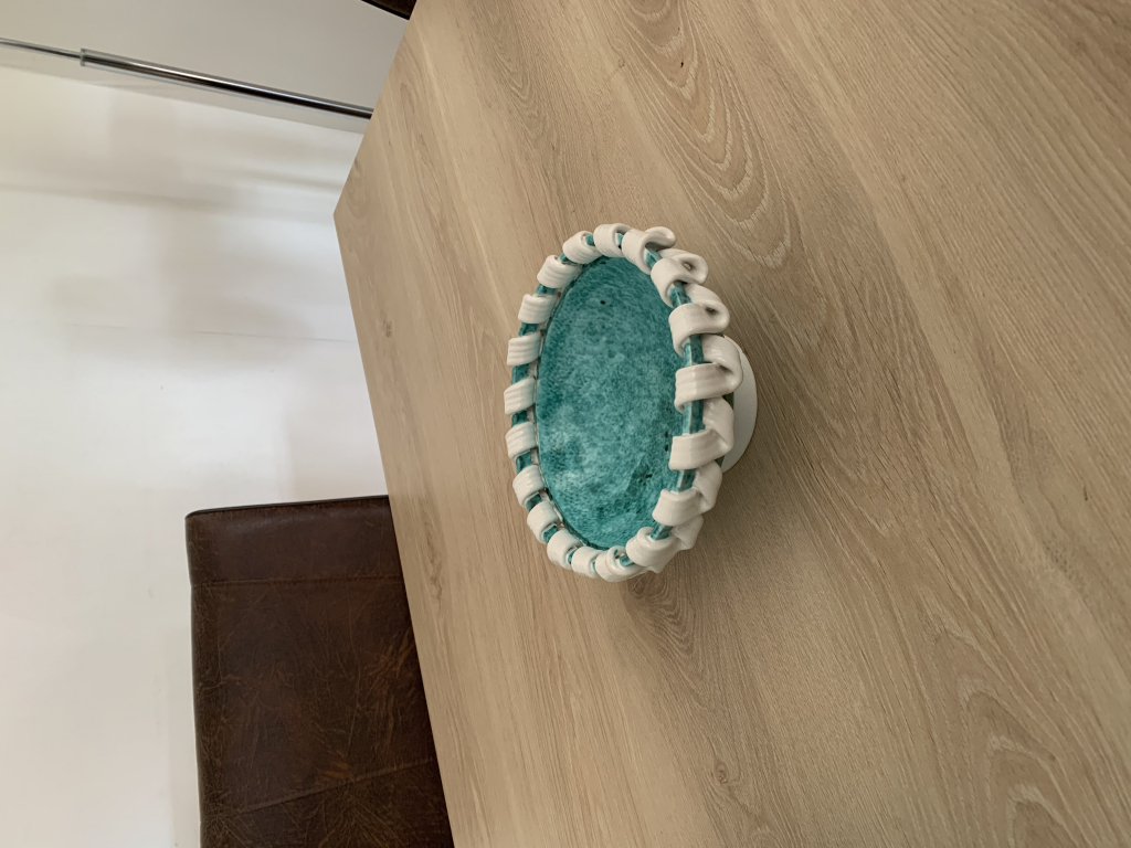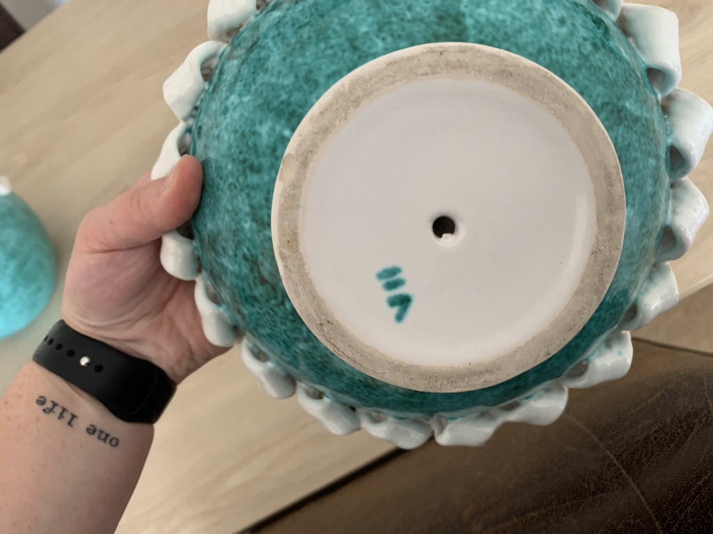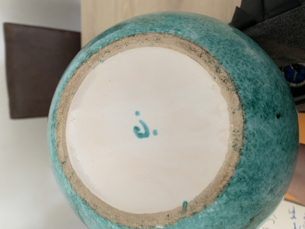 "Vase et coupelle qui sont chez ma grand mère et qui viennent de sa grand mère. Céramique, sous le vase une signature peu compréhensive et sous la coupelle le chiffre VII. Je vous joins les photos"