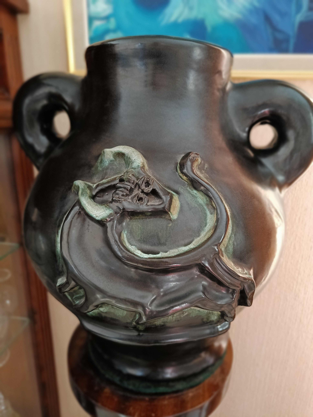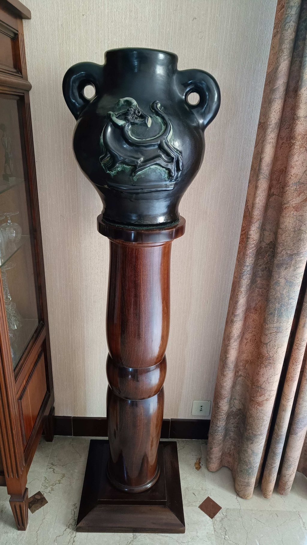 "Grans vase noir sur colonne vernie en bois massif"