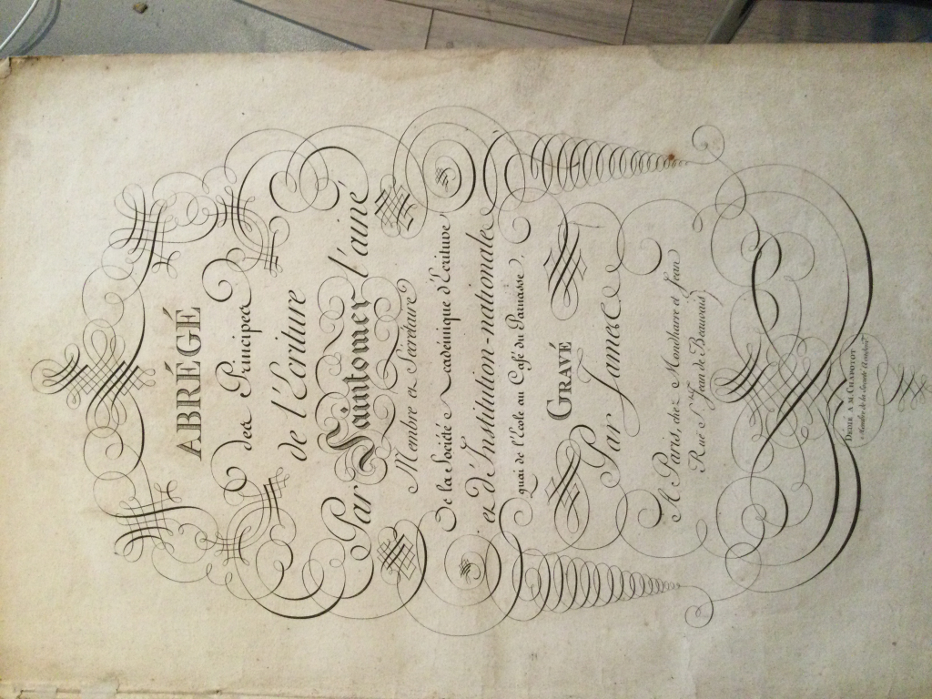 "Par Saintomer l’ ainé et gravé par Jame.. Jean de Montainville. 1789. Grand livre sur l’ abrégé de l’écriture et la calligraphie . Papier épais style parchemin. Contient 37 pages’ soit le double en recto verso"