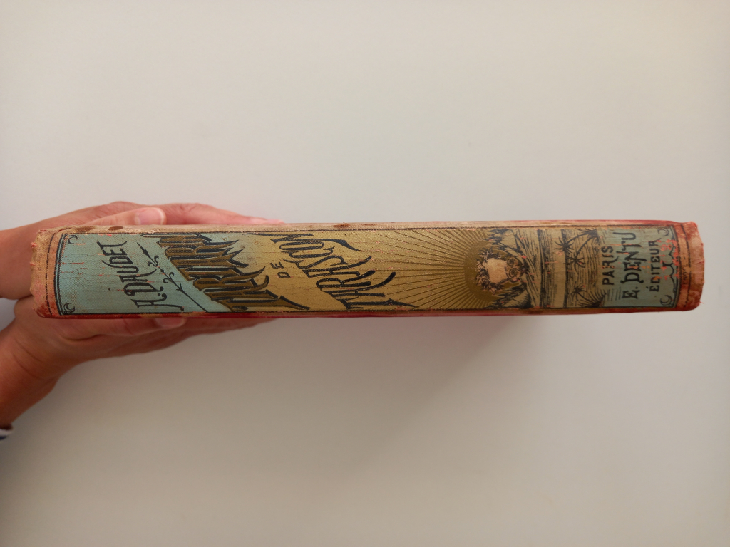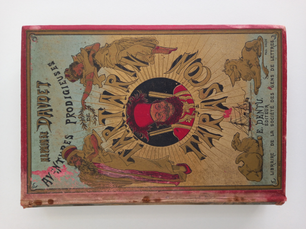 "Paris E. Dentu 1887. Percaline polychrome sur le premier plat. Dos illustré. Deuxième plat estampé à froid, tranche supérieure dorée. Plat représentant Tartarin dans un décor colonial gravé par Paul Souze. Illustrations gravées sur bois par Auguste Lepère."