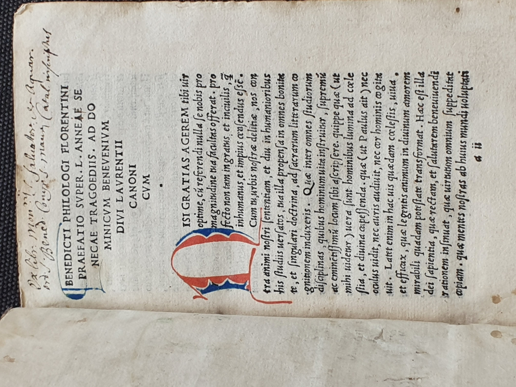 "Benedictus ‘Philologus’ Riccardinus 1506 Les tragédies de sénèque 1506 par philippi Guinti Florntini (Voir colophon à la fin) Benedictus ‘Philologus’ Riccardinus 1506 Environ 450 Pages. Pas de pages manquante. Sur chaque page de l'ouvrage, Plusieurs lettres sont enluminés (voir photo). Manuscrits? Beaucoup d'inscription en marge par ailleurs."