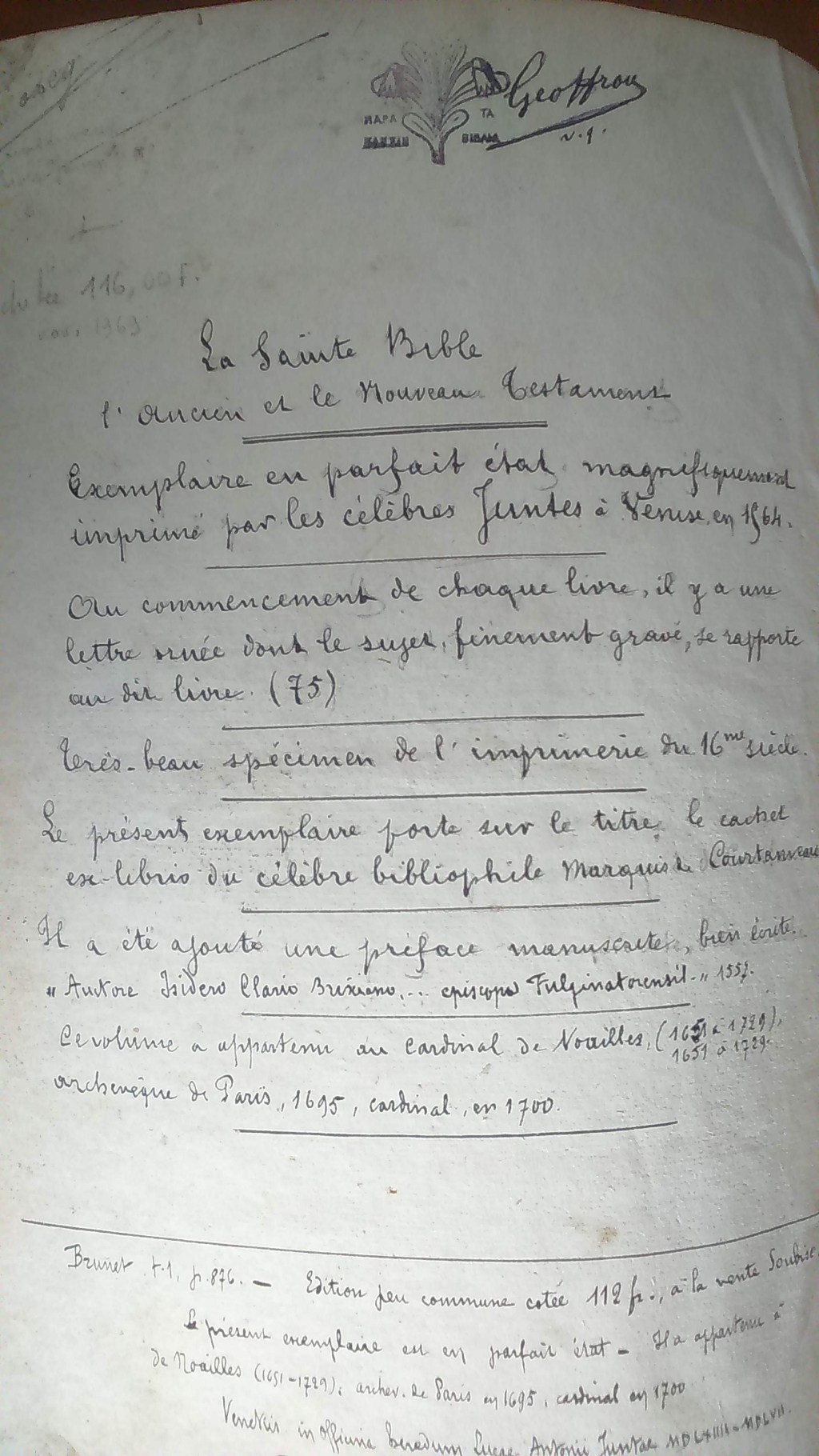 "Ayant appartenu à l'archevêque de Paris De Noailles"
