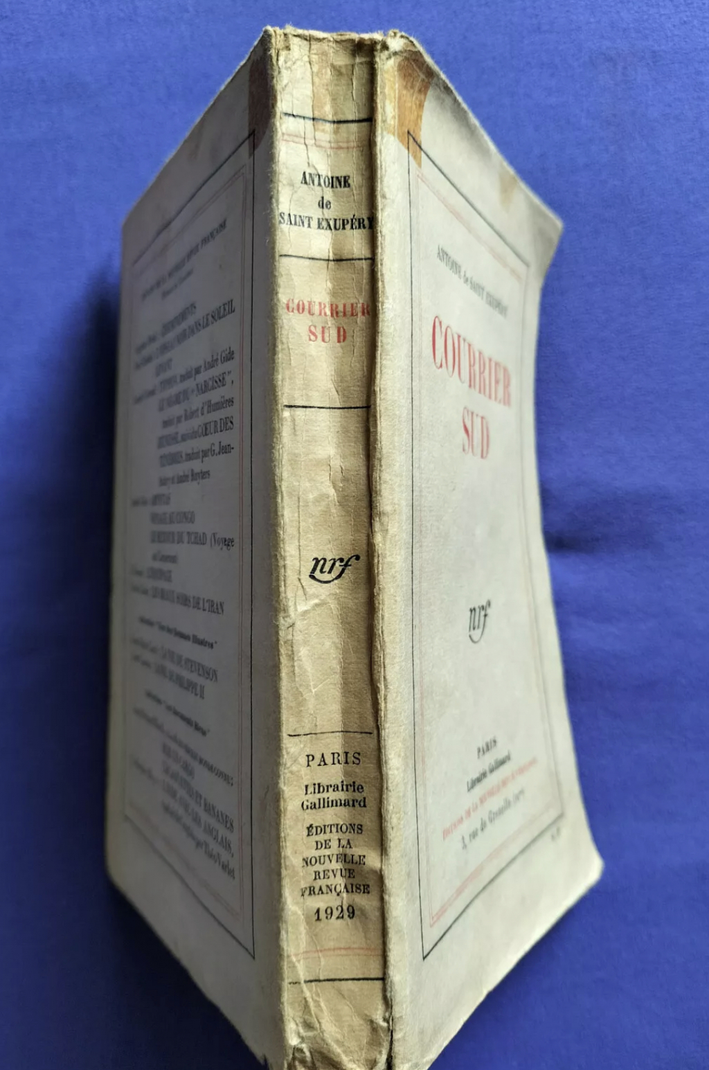 "Antoine de Saint-Exupéry, Courrier sud, couverture souple. Nrf, Paris 1929, 12x19cm, broché. Ce premier roman de l’auteur est en mauvais état (salissures, traces de scotch, voir photos), mais il est complet. Édition originale du service de presse. Précieux envoi autographe signé de l'auteur à Maître Henri Robert Henri-Robert (4 septembre 1863 à Paris - 12 mai 1936 à Paris) est un avocat et historien français, bâtonnier de l'ordre des avocats de Paris et membre de l'Académie française."