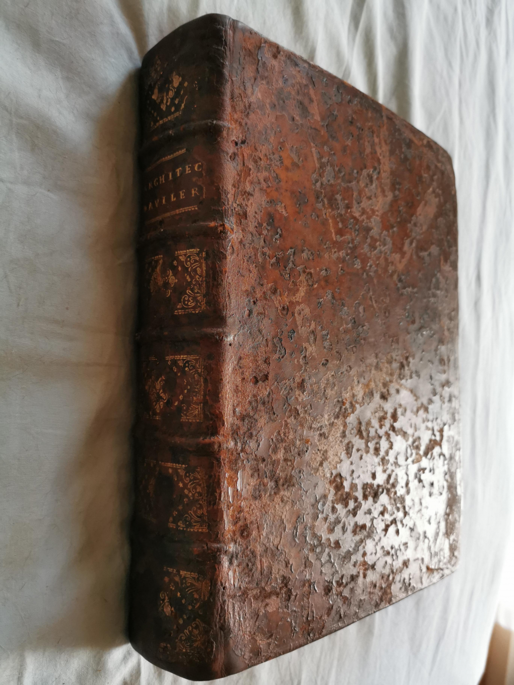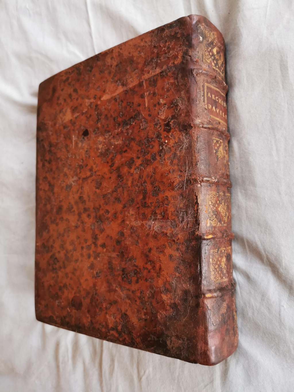 "Ce livre a été découvert en état de conservation moyen du fait de son rangement dans un grenier durant de nombreuses année. La livre avait souffert notamment la couverture. A sa redécouverte le livre a été confié à une restauratrice qualifiée. Elle a procédé a des greffes de cuir sur la couverture. Les pages ont été vérifiées et certaines gravures recollées selon les règles de l'art."