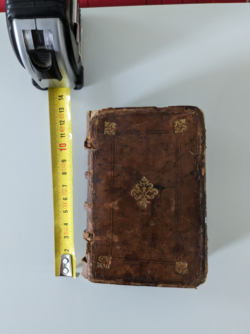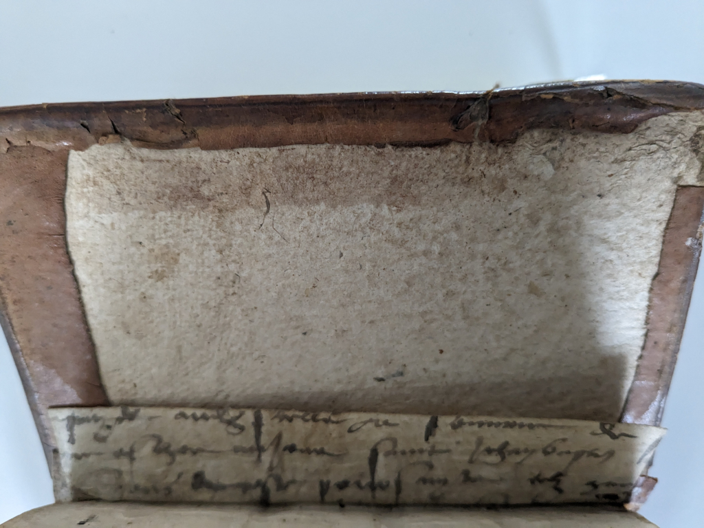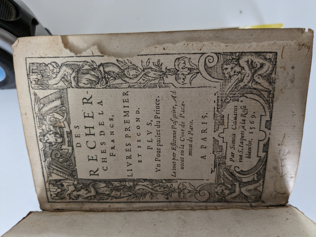 "Couverture abimée Des recherches de la France, livres premier et seconde, plus un pour parler du Prince Le tout par Estienne Pasquier, advocat en la cour de Parlement de Paris, A PARIS. Par Simon Caluarns, rue St Iaques à la Rche Blanche, 1569"