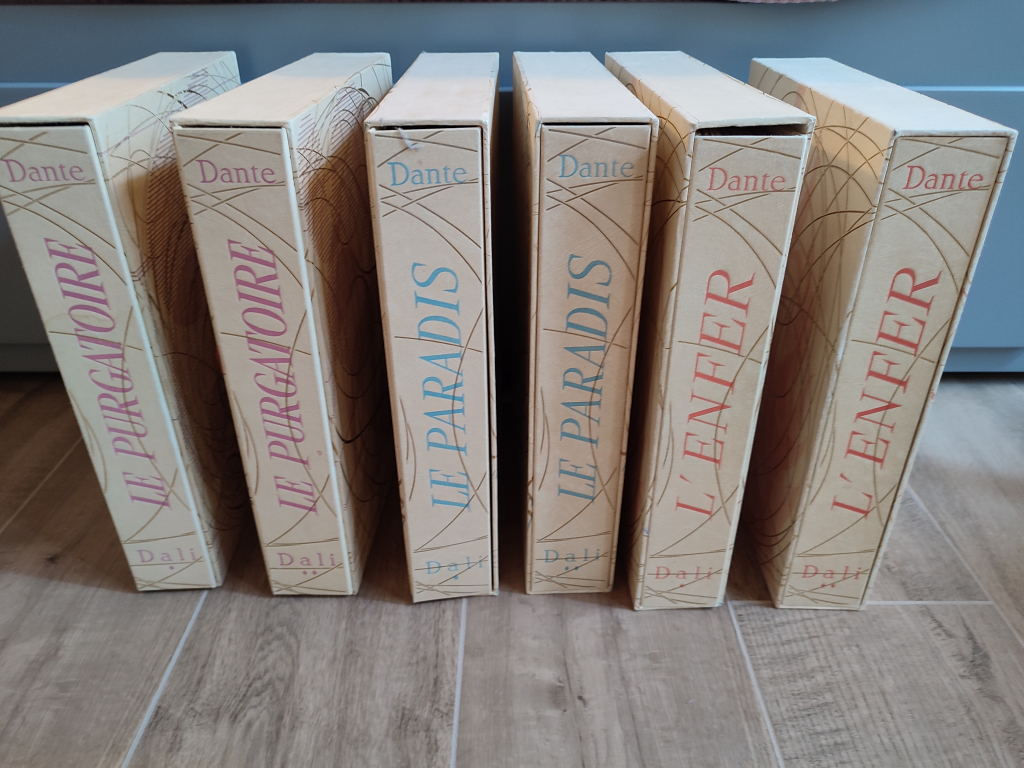 "Bonjour, Nous sommes en possession de ces 6 volumes d'apparence complets des Éditions d'art les heures claires. La Divine Comédie de Dante illustrée avec des lithographies aquarelle de Dali La collection de compose de 6 volumes : Le purgatoire : 2 volumes Le paradis : 2 Volumes L'enfer : 2 volumes Nous avons une boîte supplémentaire de l'enfer volume 2 mais elle est vide C'est notre grand père qui en avait fait l'acquisition dans les année 70. Nous sommes à la recherche d'une estimation pour éventuellement les vendre. Merci pour vos conseils. Cordialement"