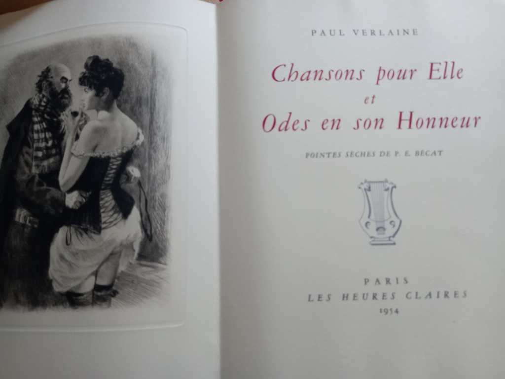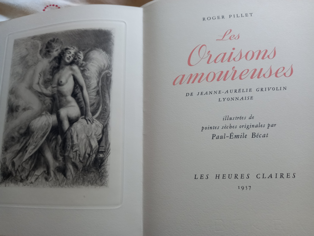 "2 livres édition les heures claires 1954 et 1957 : ROGET PILLET "les oraisons amoureuses" illustrées de pointes sèches originales de PAUL EMILE BECAT et PAUL VERLAINE et " chansons pour Elle et Odes en son honneur" illustrées de pointes sèches originales de PAUL EMILE BECAT"