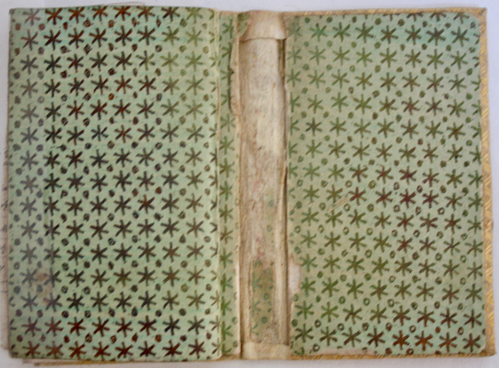 "Chez M. Guillot, á Paris, In-32 avec 2 cartes dépliantes ; cartonnage de papier peint, décor de caissons dorés sur le dos, sur les plats, large encadrement de cuir vert orné de feuillages et filets dorés et d'une guirlande de feuilles évidées laissant apparaître le papier métallisé rouge qui recouvre le plat ; dans le rectangle central de papier métallisé rouge décoré de corbeilles de fleurs et de feuillages, médaillon ovale peint sur vélin représentant, sur le premier plat, un angelot debout près d'un grand vase dans un jardin, et sur le plat inférieur, un grand vase dans un décor champêtre ; miroir encadré d'un galon doré au contreplat supérieur, pochette de papier rose au contreplat inférieur, gardes de papier dominoté, tranches dorées ; avec étui de maroquin rouge doublé de tabis bleu, dos lisse orné, encadrement et lyre centrale dorée sur les plats."