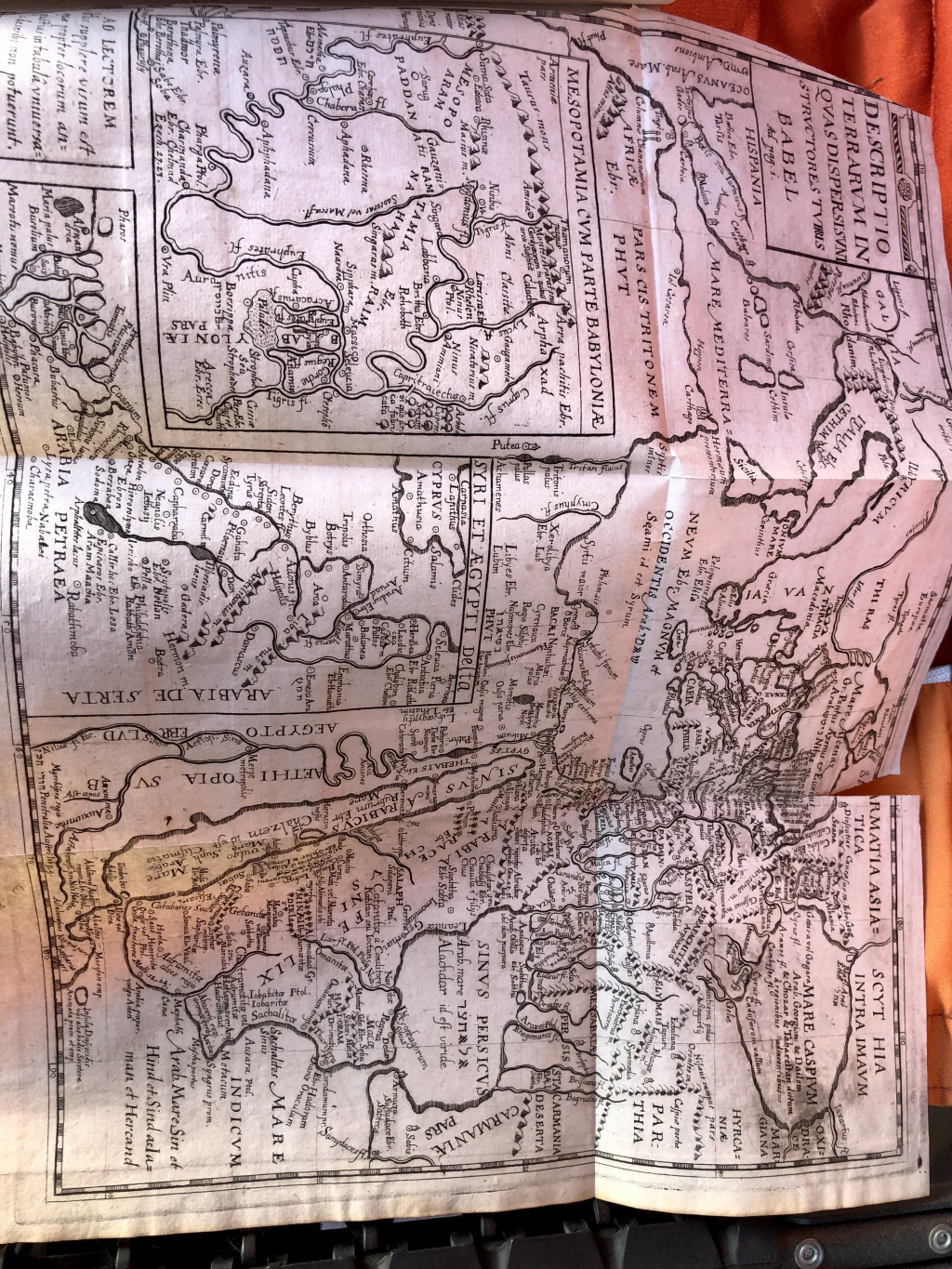 "Livre de 1738 écrit en latin,paragraphes en grec et en hébreu.., s’intitulant Geopgaphia Sacrea ..A l’intérieur il y’a des cartes qui se déplient ..Ce livre appartenait à mes grands parents"