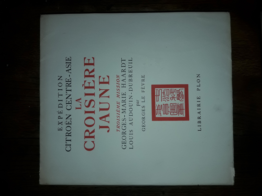 "Georges-Marie Haardt et Louis Audouin-Dubreuil. La Croisière Jaune. Troisième mission Georges-Marie Haardt-Louis Audouin Dubreuil Paris Librairie Plon 1933. Volume In-4 carré, broché, couverture rigide rempliée, premier plat décoré d'un sceau chinois rouge, 344 pages, enrichi de 6 cartes dont 3 hors-textes et illustré de 123 photographies en noir et blanc. Frontispice représentant Georges-Marie Haardt. Exemplaire réservé au Colonel Fauché avec un envoi manuscrit sur la page de garde d'André Citroën."