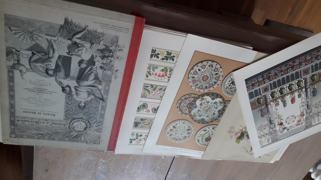 "Le Journal de la Décoration , recueil de dessins à l'usage des arts industriels . Edition Armand Guérinet .Deux albums de 60 planches chacun , non reliés , Complets donc 120 planches , les planches sont en très bon état , Les reliures sont un peu usagées . Epoque Art Nouveau ,"