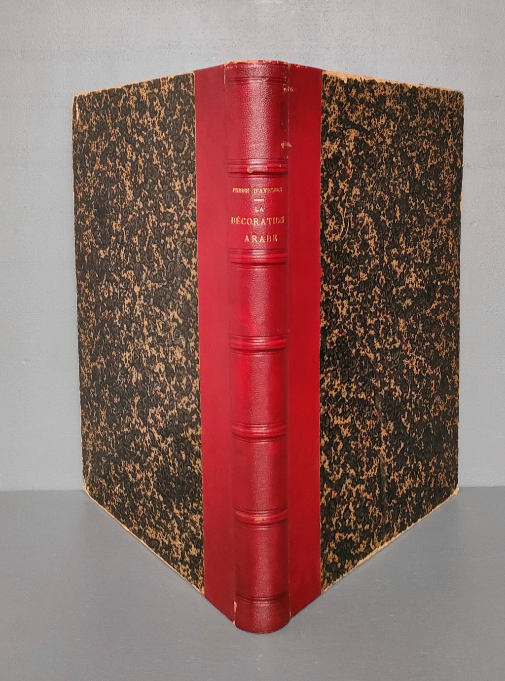"Première impression de 1885 des extraits de l'ouvrage de Prisse d'Avesnes " L'art arabe d'après les monuments du Kaire depuis le VIIe siècle jusqu'à la fin du XVIIe siècle ". ( 1869- 1877 ) Ce tirage, non paginé de 1885 par J.Savoy & Cie comprend 102 planches lithographiées sur onglets et 4 pages de titre des planches en début d'ouvrage. Il couvre la période du XIIe au XVIIe siècle. Reliure demi maroquin rouge d'époque, dos à nerfs, plats mouchetés. Reliure bien solide, bords frottés, coins émoussés et quelques griffures mineures au dos, coiffes non frottées. Cahiers bien propres, exempts de tout accident, rousseurs ou annotation. A noter que deux doubles planches sont volantes. Bel exemplaire."