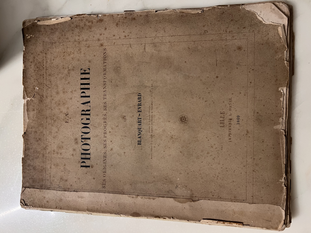 "Livre de 1869 de Blanquart Evrard dédicacé par l’auteur en état moyen de conservation illustré de 13 photographie et gravure acheté en brocante il y a 30 ans environ."