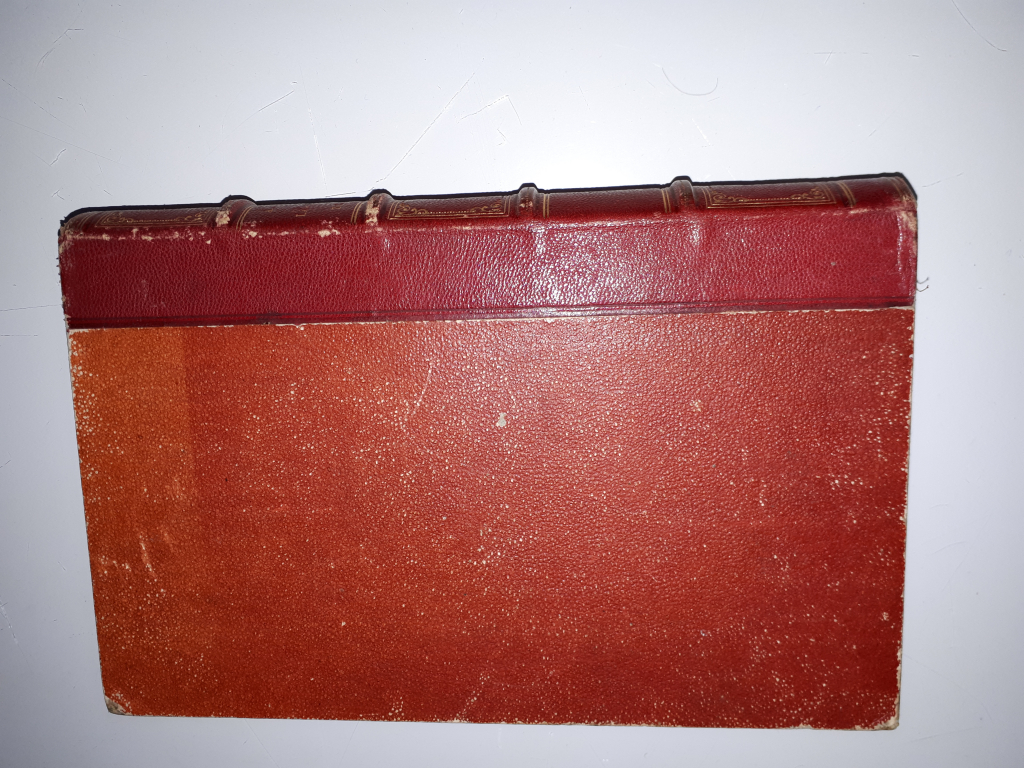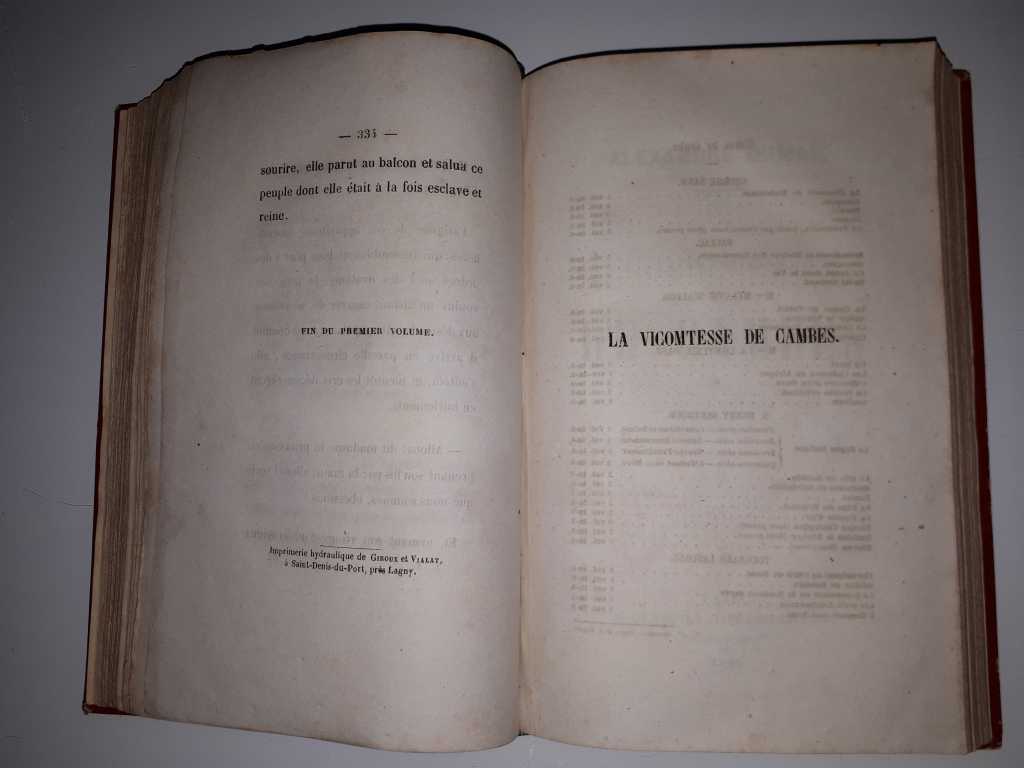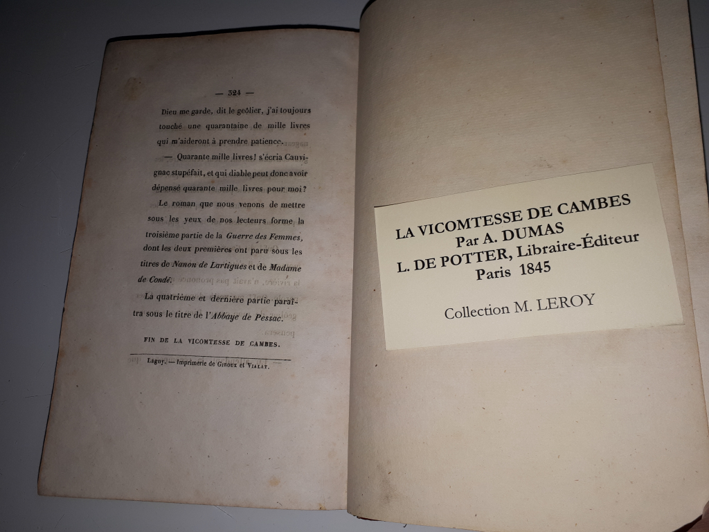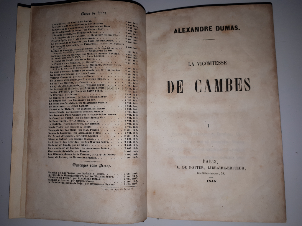 "livre d'Alexandre Dumas de 1845, éditions L De Potter. Reliure rouge, moulurée sur la tranche, inscription 1-2, complet, quelques pages tachées (champignon?), intérieur de la couverture ayant eu une étiquette et nom manuscrit sur première contre page."