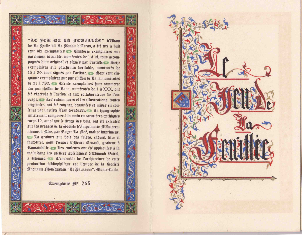 France estimations a reçu la demande d'estimation suivante intitulée par le déposant : Le jeu de la Feuillée par De La Halle dit le Bossu d'Arras Editeur S.A. "Le Parnasse" Monte Carlo DL 1964 N° édition: 245/810.