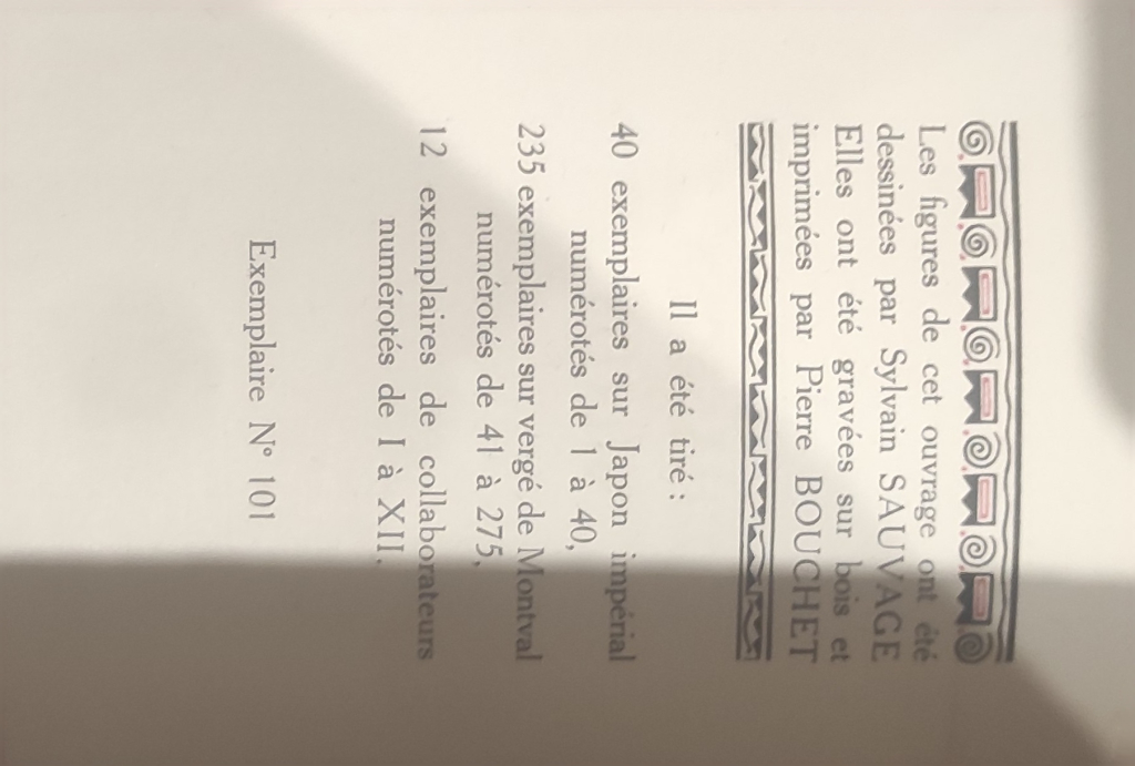 "Pierre Louis 15 novembre 1927 imprimerie Pierre Boucher Exemplaire n: 101 / 287 sur papier vergé de Montval"