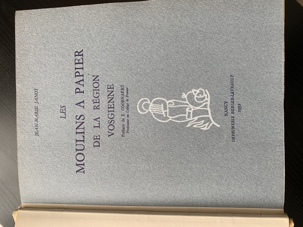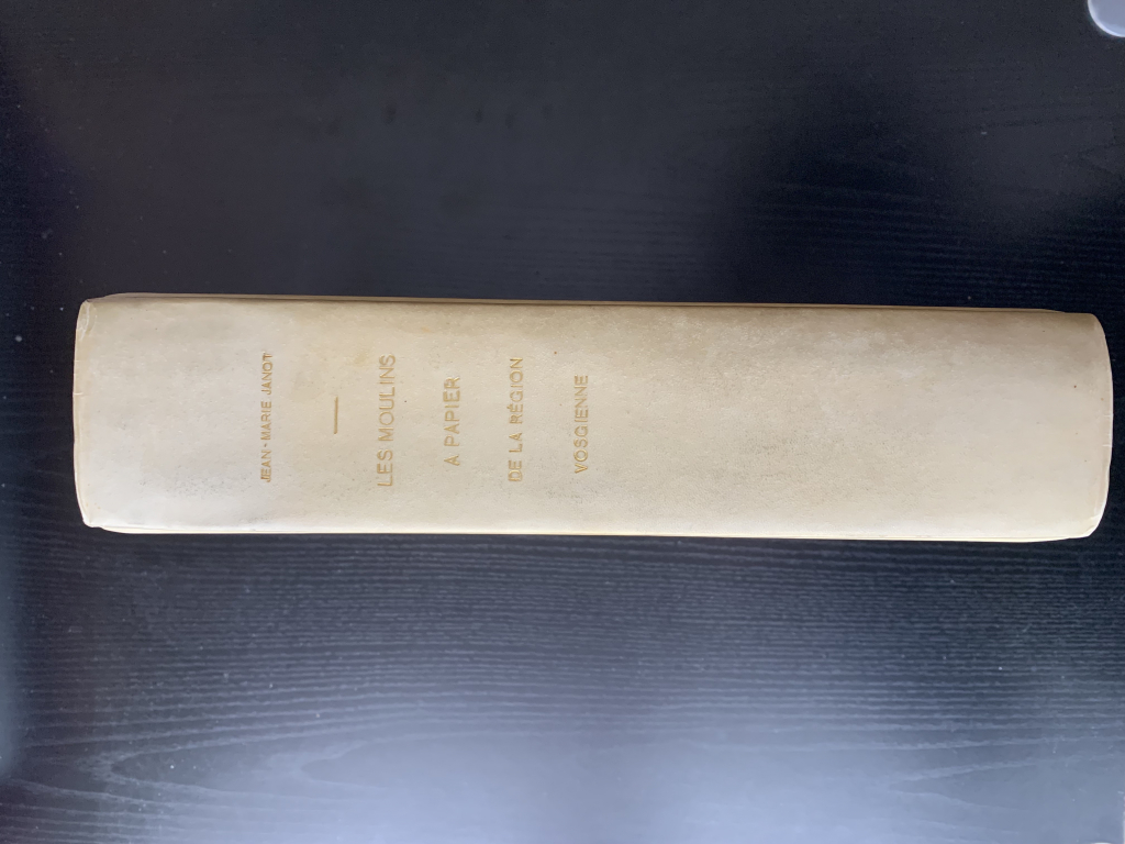 "Auteur: Jean-Marie JANOT. conservateur des antiquités et objets d'art des Vosges. Début de l'étude sur les papeteries :1944 , ouvrage publié en 1952 :un double volume illustré de magnifiques planches. ( tirage en 600 exemplaires.) Les papiers de chiffon à la forme ,VERGES et VELINS ont été fabriqués spécialement par les papeteries de LANA à DOCELLES. Ouvrage en très bon état. (exemplaire :196) L'ouvrage est accompagné du filigrane de ST -ANTOINE patron des papetiers Vosgiens, dessiné par: Géo Condé."