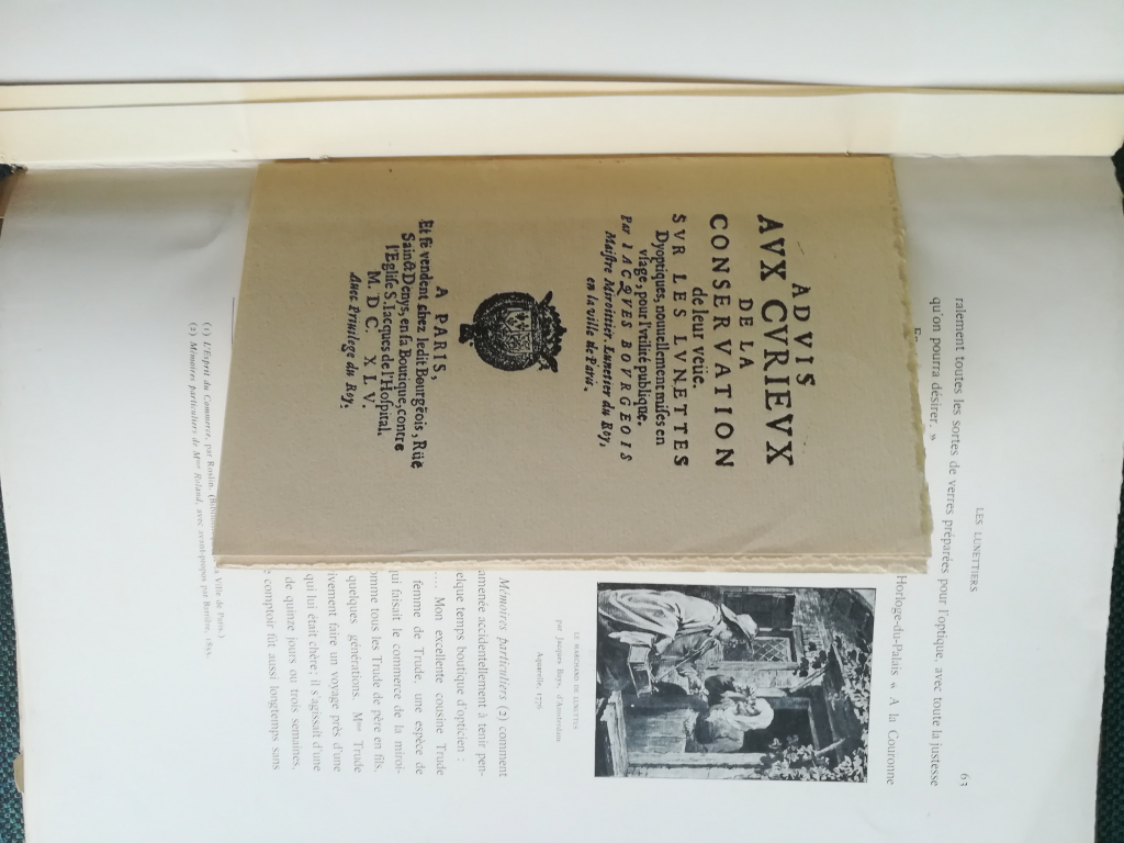 "Edition de cette étude divisée en deux parties, la première sur les lunettes, et la seconde sur les lorgnettes. Un des 300 exemplaires numérotés (n° 159). Plusieurs planches en couleurs. Entre les pages 62 et 63 est relié un facsimilé de 12 pages : "Advis aux curieux de la conservation de leur veüe. Sur les lunettes" (1645)."