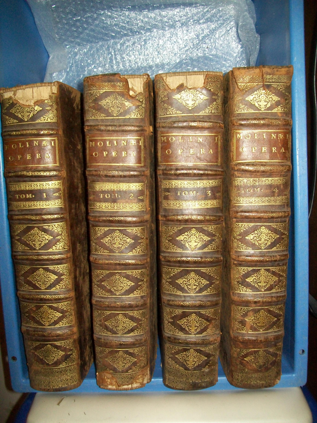 "Livres anciens reçus en héritage, couverture cuir sur bois, tomes 1 à 4."