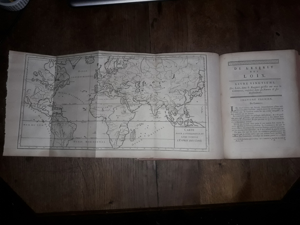 "Montesquieu De l’esprit des Loix Nouvelle édition à Genève chez Barillot et Fils en 1749 2 Parties en 1 Vol in-4, Basane époque Bien complet de sa carte dépliante Bel exemplaire en bon état"