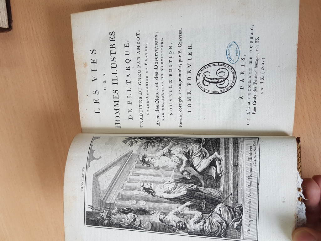 "Il s'agit du livre "les vies des hommes illustrés traduit du grec par Amyot, avec des notes et des observations par mm brotier et vauvilliers. Cette édition est réalisée à Paris de l'imprimerie de cussac, An IX (1801)."