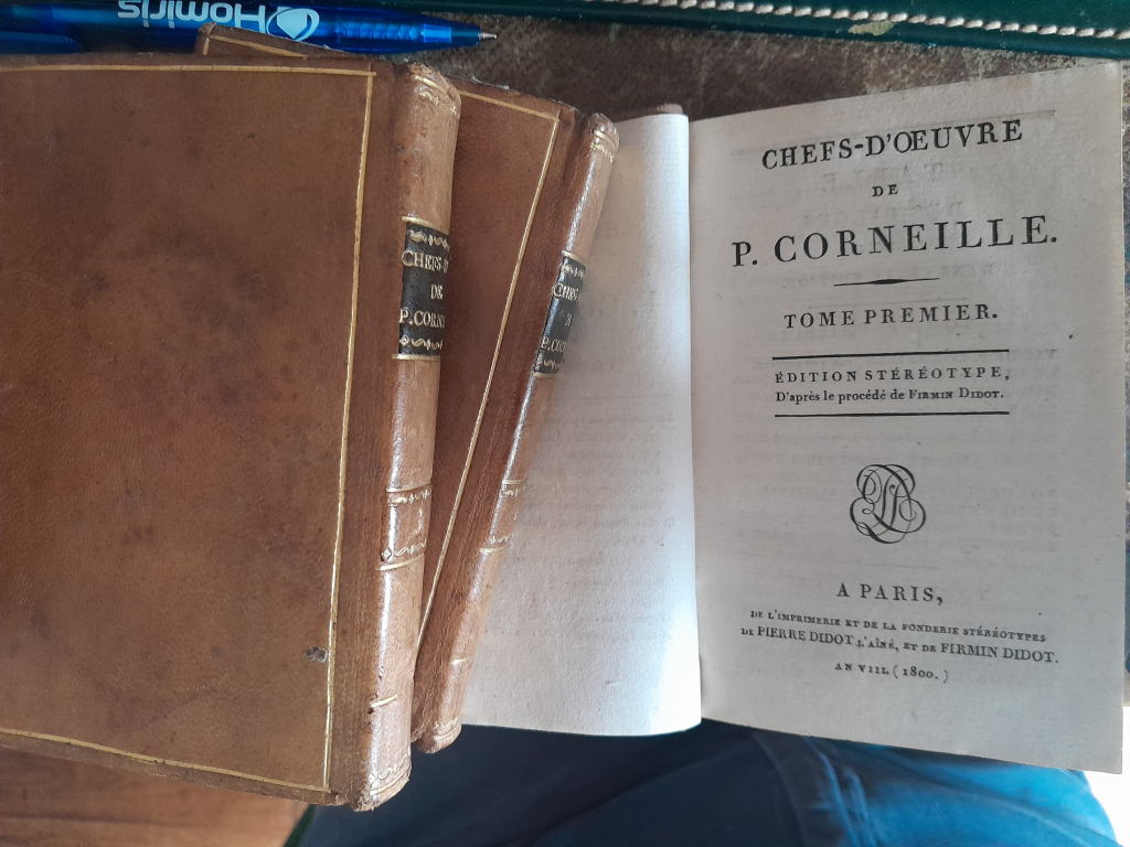 "Titre complet : Chefs d'œuvre de P. Corneille en trois volumes (voir le détail des titres par volume dans les photos) Edition stéréotype d'après le procédé de Firmin Didot , Paris imprimerie et fonderie stéréotypes Pierre Didot l'aîné et Firmin Didot Année 1800 Etat : plutôt bon cuir élimé aux angles mais pas corné, aucune page manquante ni déchirée bon état des cahiers"