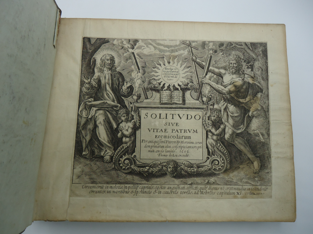 "En latin, religion et solitude - A priori début XVII ème siècle - Gravures numérotées représentant des scènes de prière et de solitude de religieux, certaines signées - Reliure cuir brun frottée sur bords et plats, coins émoussés, nombreuses paries du dos épidermées, 3 mors fendus - 5 parties : ~Solitudo Sive Vitae Patrum Eremicolarum, 1606 - Thomas de Leu excudit ; 29 planches. ~Trophaeum Vitae Solitarae : 28 planches sur 29 numérotées. ~Sylvae Sacrae : 23 planches sur 25.~Oraculum Anachoreticum : 24 planches sur 25. ~Solitudo Sive Vitae Foeminarum Anachoritarum Ab Ius To Sadeler : 22 planches sur 24 - Total de 126 planches sur 132 numérotées + 5 frontispices. Les noms Marco Sadeler et Marti de Vos reviennent régulièrement. Les gravures semblent accolées aux pages, la première est en vergé, les autres peut-être en velin. Les pages mesurent 21 x 26 cm, la taille des gravures varient de 16 à 17 x 20 à 21 cm environ - Format oblong. Les gravures sont en bon état, le 1er frontispice présente quelques brunissures sur le côté droit, quelques unes présentent de petites salissures ou rousseurs, la plupart sont intactes. Je ne sais pas s'il vaut mieux que je vende ces gravures pièce par pièces, ou en un seul lot. Si besoin, j'ai de nombreuses images disponibles. Cordialement."