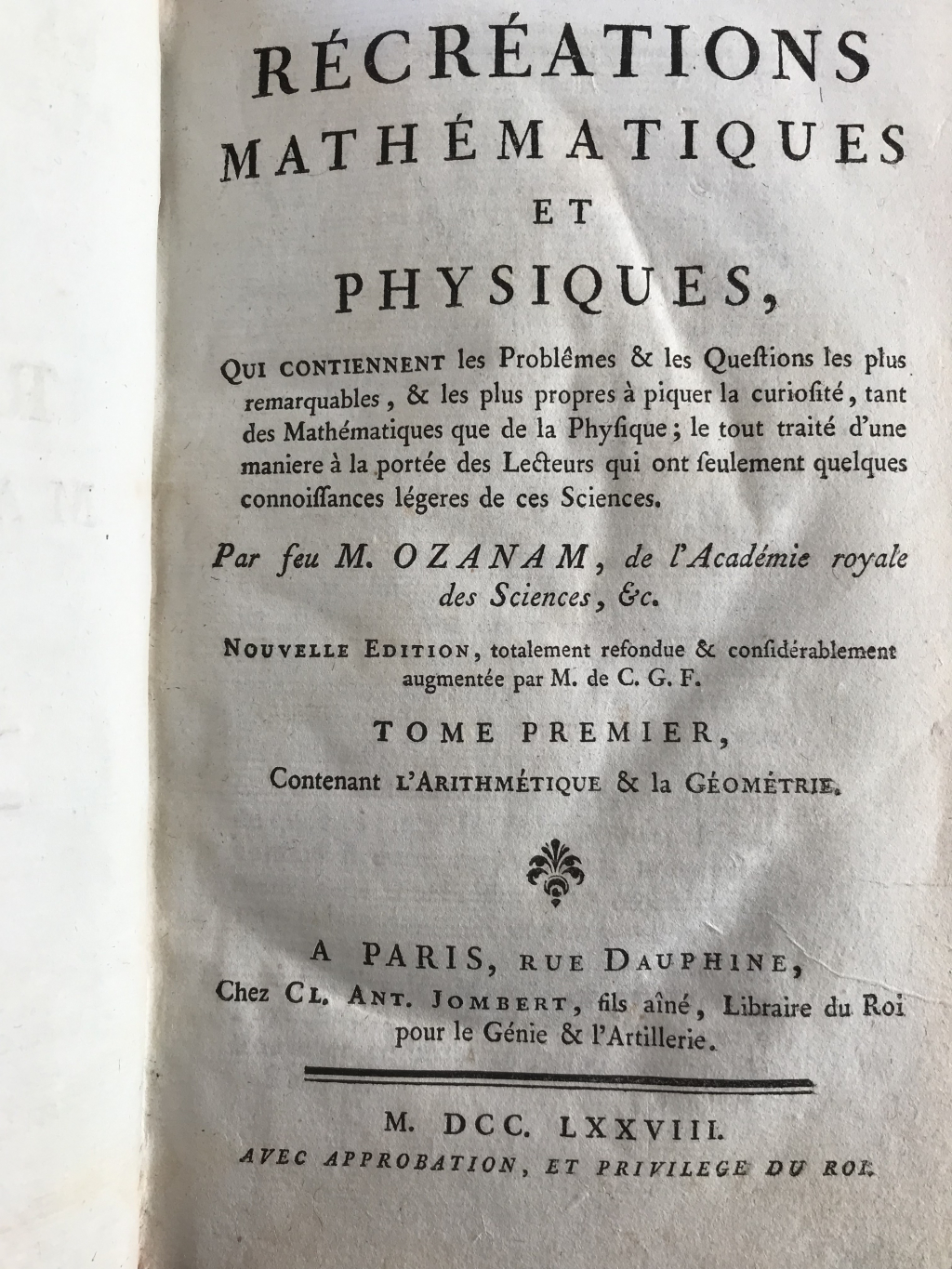France estimations a reçu la demande d'estimation suivante intitulée par le déposant : Récréations mathématiques et physiques de 1778.
