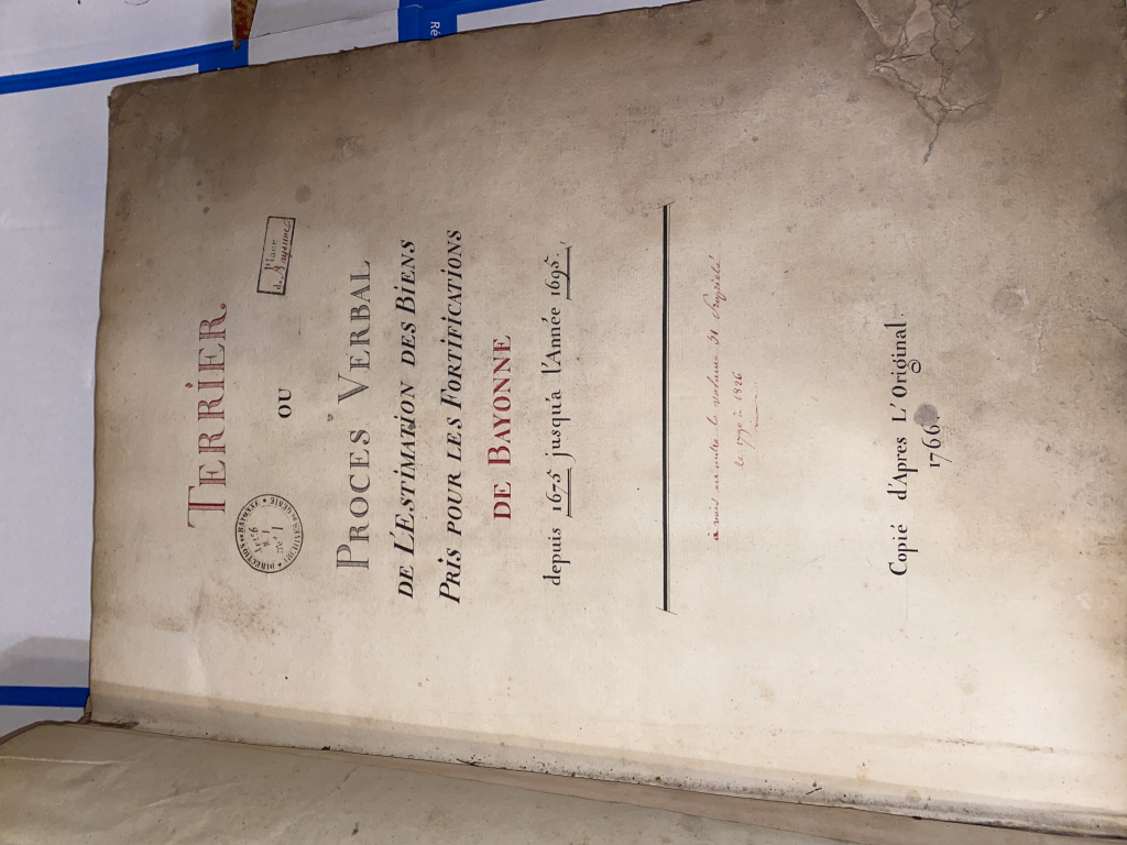 "Concernant les estimations des biens pris pour les fortifications de bayonne depuis 1675 jusqu’à l’année 1695 Copié d’après l’original 1766 (Trouver dans un grenier j’ignore si cette ouvrage a une quelconque valeur pourriez vous me renseigner merci d’avance)"