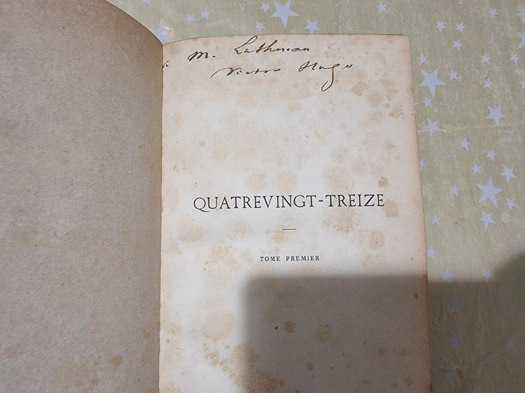 "Victor Hugo, livre Quatre-vingt treize, premier récit tome 1 , Michel Levy 1874 , quelques rousseurs. Exemplaire enrichi d un envoi autographe signé de Victor Hugo"