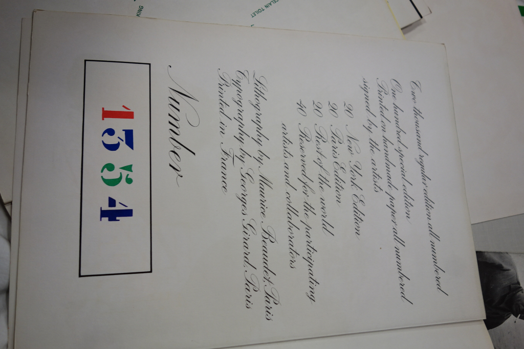 "Ouvrage en feuilles, sous étui, comprenant un ensemble de 62 lithographies et sérigraphies sur BFK Rives dont 34 à double page de Pierre Alechinsky, Karel, Appel, Enrico Baj, Alan Davie, Jim Dine, Oyvind Fahlstrom, Sam Francis, Robert Indiana, Alfred Jensen, Asger Jorn, Allan Kaprow, Alfred Leslie, Roy Lichtenstein, Joan Mitchell, Kiki O.K., Claes Oldenburg, Mel Ramos, Robert Rauschenberg, Reinhoud, Jean-Paul Riopelle,James Rosenquist, Antonio Saura, Kimber Smith, K.R.H. Sonderborg, Walasse Ting, Bram van Velde, Andy Warhol et Tom Wesselmann"