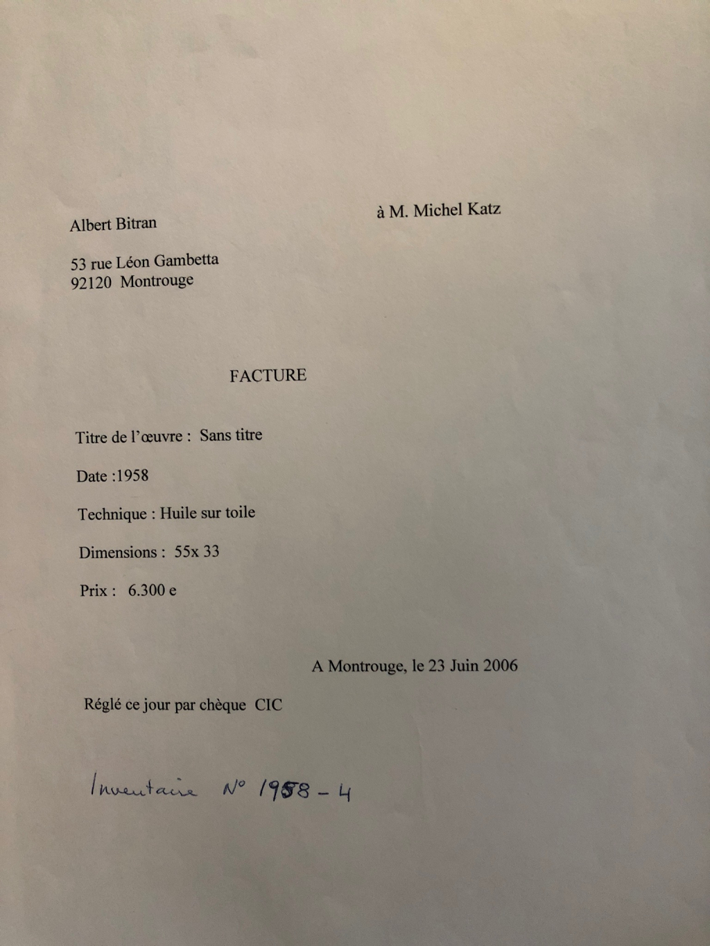 France estimations a reçu la demande d'estimation suivante intitulée par le déposant : Albert BITRAN / huile sur toile/ 1958.