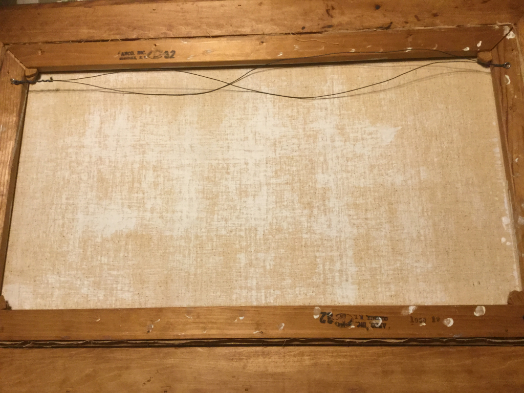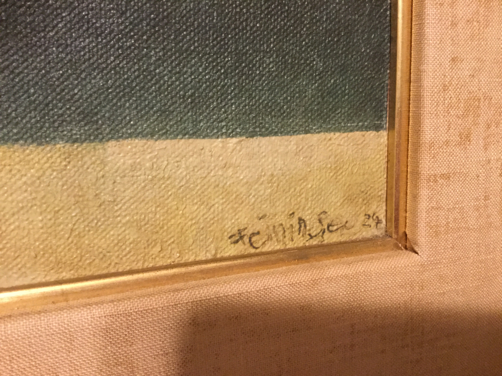 "La toile est signée Feininger 29 J’ignore si il s’agit de l’année. Il manque de peinture, à quelques endroits on aperçoit le fond de la toile ."