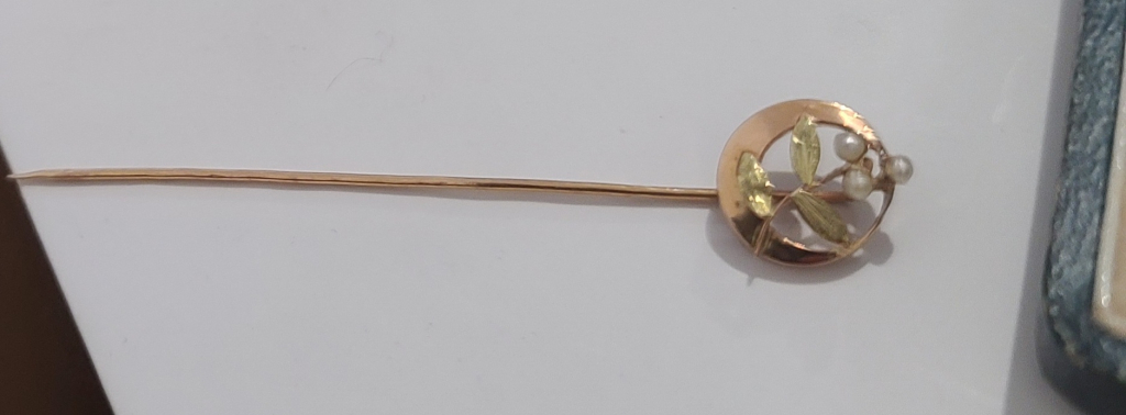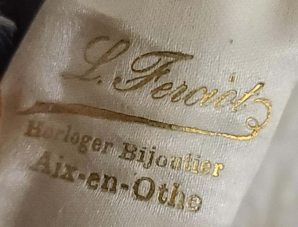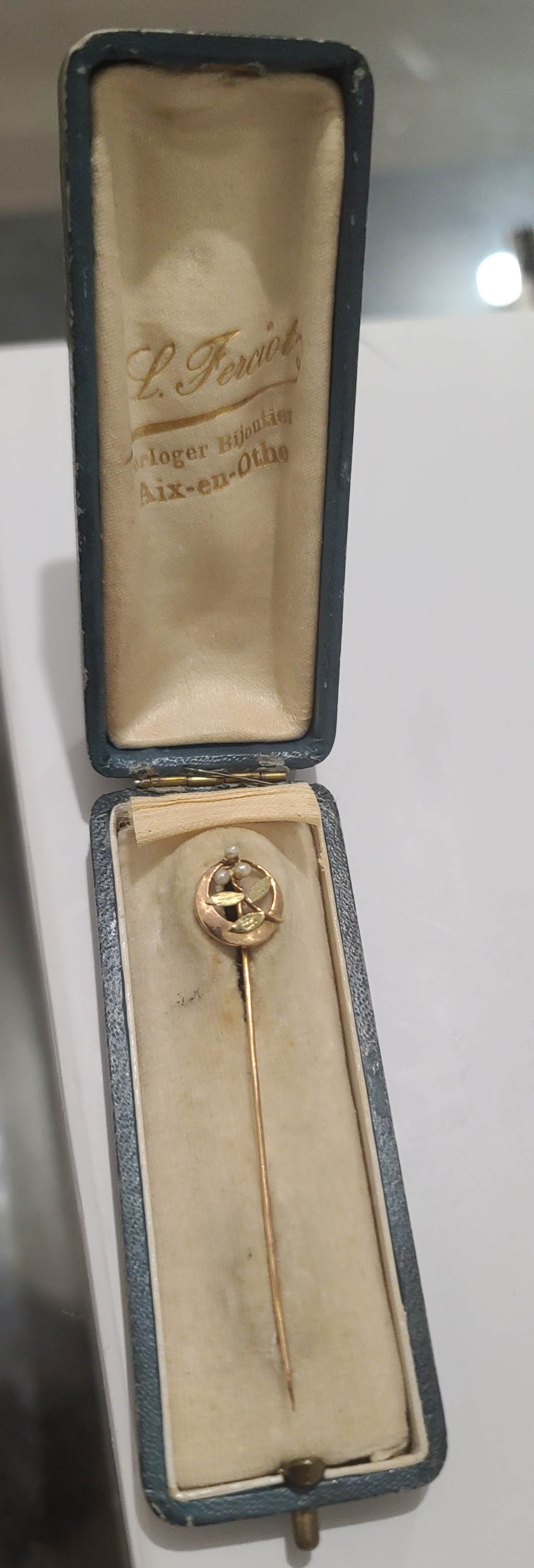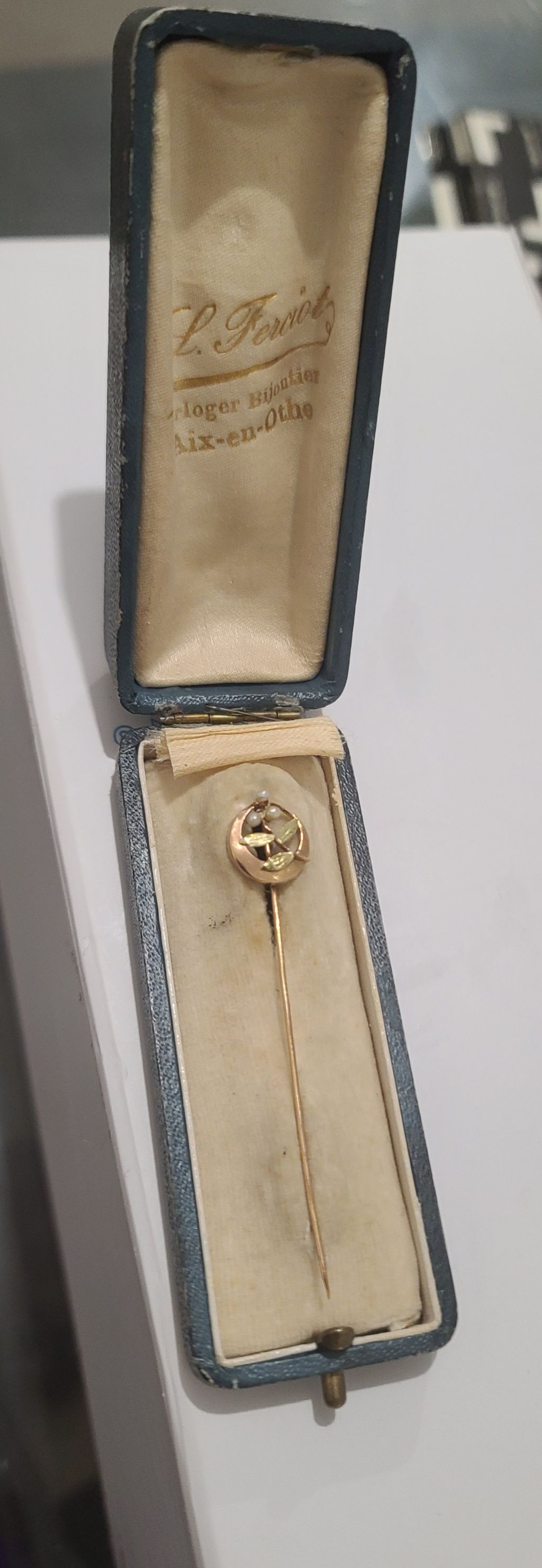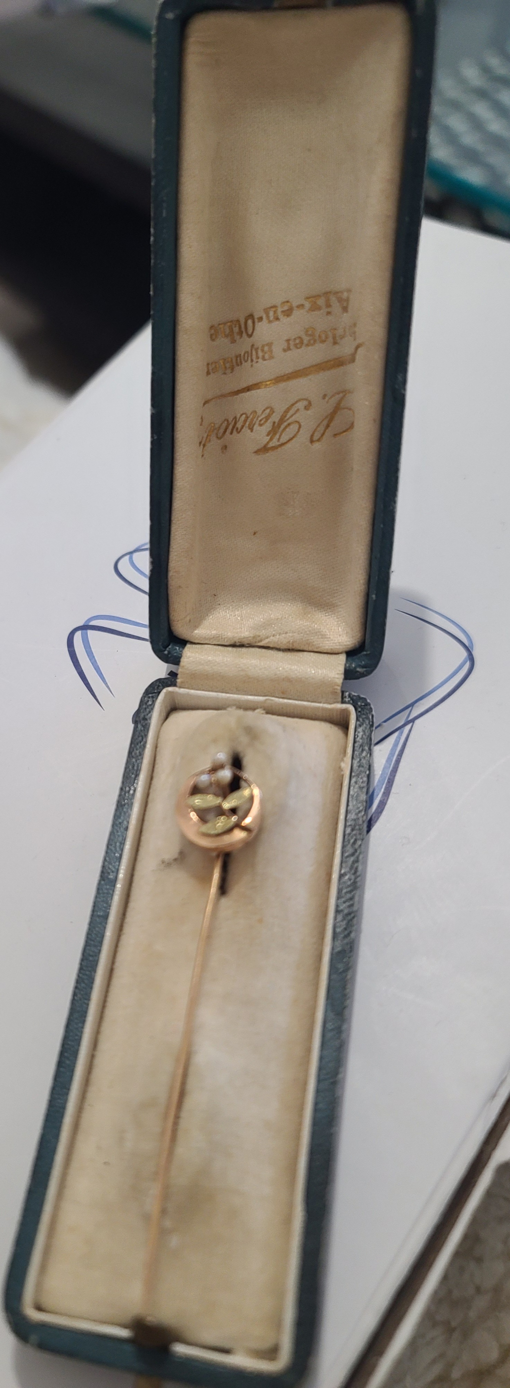 "Bonjour, Je cherche une estimation pour cette épingle ancienne (poinçon visible), longueur 6 cm, décor floral avec deux petites perles. Elle est dans son écrin d’origine signé L. Ferciot – Horloger Bijoutier – Aix-en-Othe. Période probable : 1900–1925. Merci pour votre avis !"