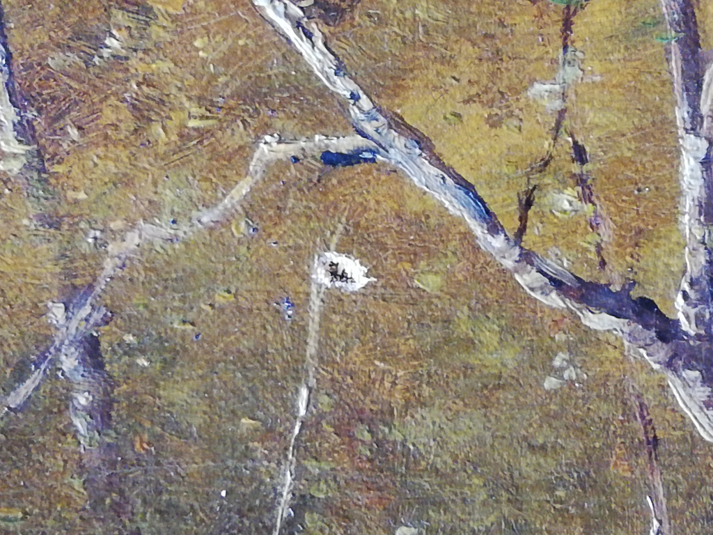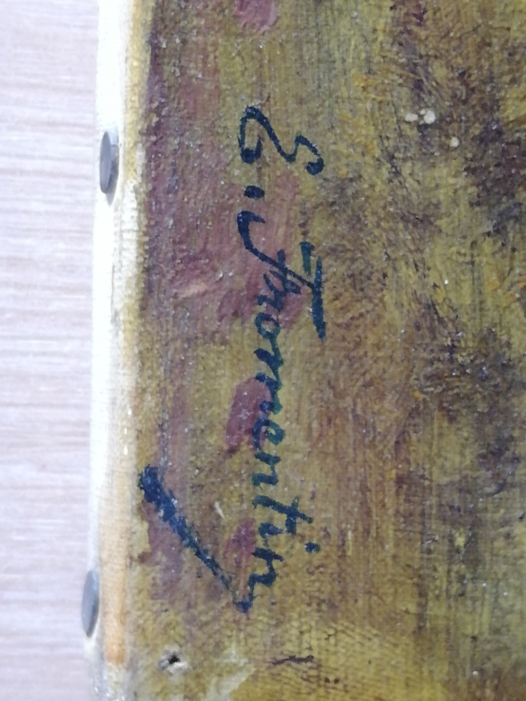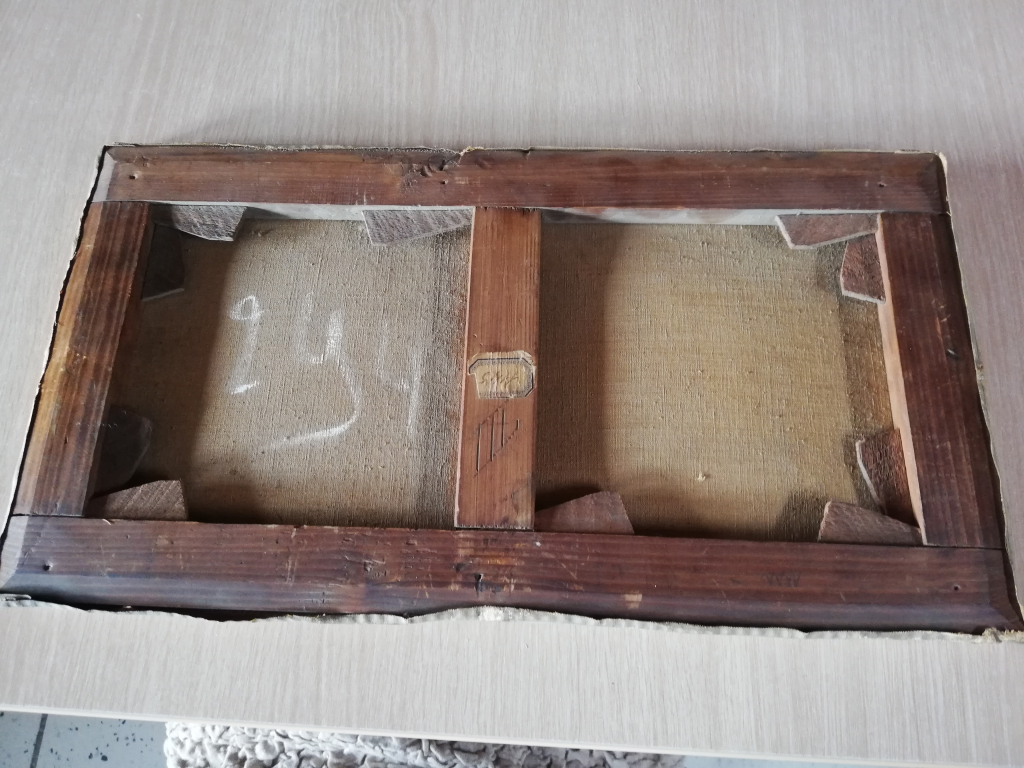 "Peinture assez ancienne berger et troupeau de mouton un tout petit trou d'usure dedans, à l'arrière il y a écris le chiffre 294 sur la toile je ne sais pas si cela concerne quelque chose. La peinture est tendue sur un cadre en bois. Difficile de décrire plus c'est une peinture qui est dans la famille depuis de très nombreuse année"
