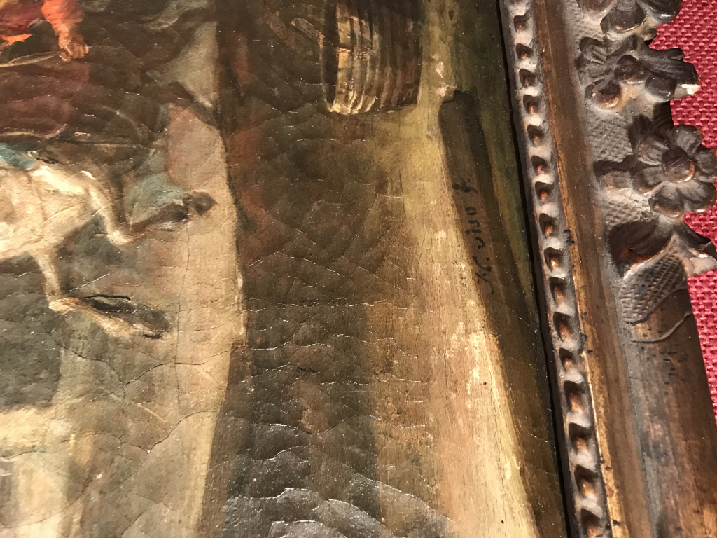 "Tableaux Huile sur toile avec cadre ancien représentant une scène de village avec des personnages signé N Viso"