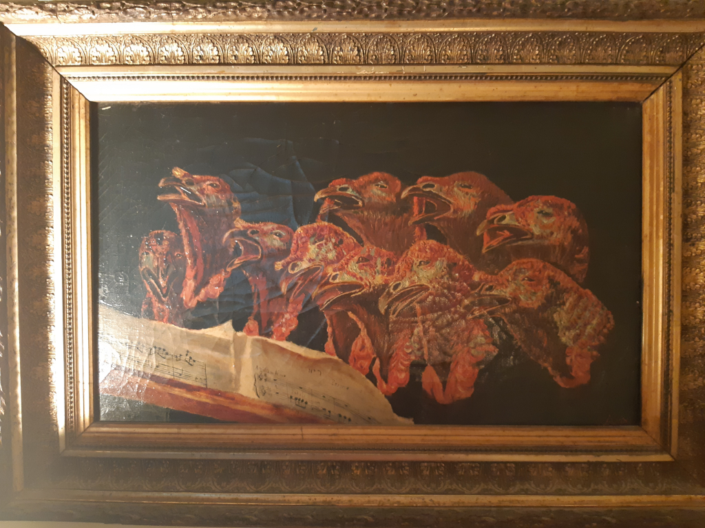 "Tableau de Jean-Roger Sourgen Etat général satisfaisant Pour les dindons qui est ce peintre animalier ? Offert vers les années 1945 par Monsieur CADET à Monsieur BRION mon grand-père tous les deux architectes installés au Maroc"